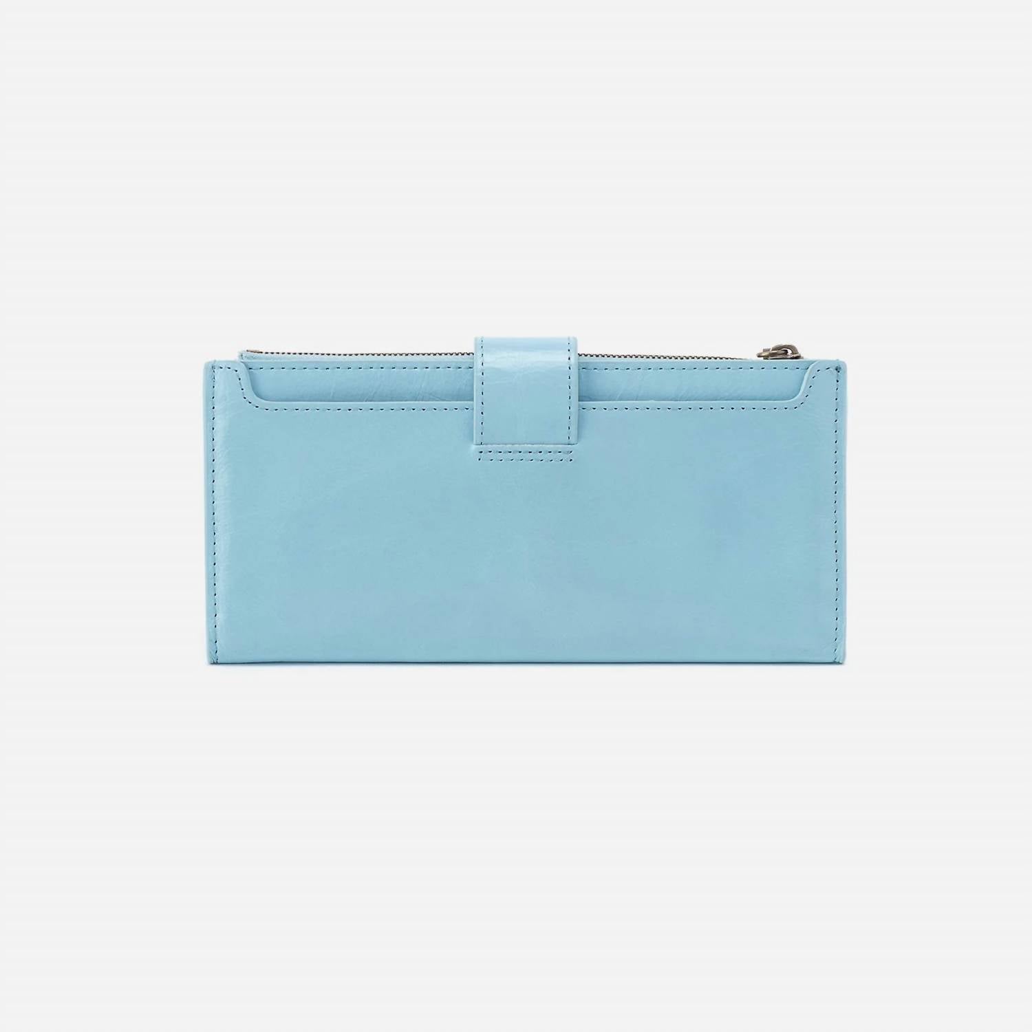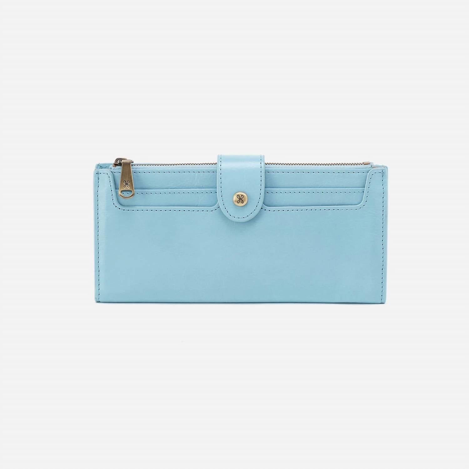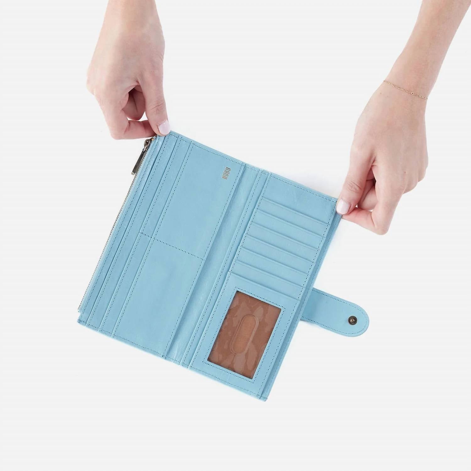 Upgrade your accessories with this chic wallet. Its standout appearance highlights your personal style, while its compartments offer efficient storage for your financial essentials. Meet your new daily essential, the Women's Dunn Continental Wallet by HOBO in a stunning Stratosphere hue. Expertly crafted from leather, this bifold wallet is designed for organization with a multitude of credit card slots, five slip pockets, an ID window, and more. Measuring 7.5" wide, it features a reliable snap closure and brushed antique brass hardware, ensuring both style and security. Care for this piece with a suede and leather protector, leather spot cleaner, and leather dressing to maintain its pristine condition.