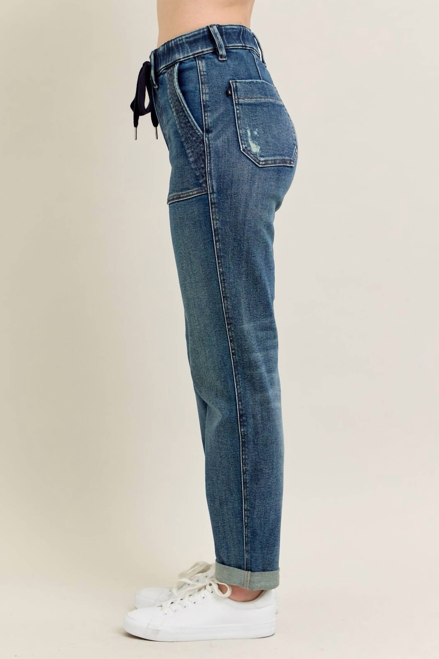 No gym necessary for these cool-girl joggers. Step into effortless comfort with the Women's Vintage Wash Jogger by Judy Blue, a perfect blend of cozy and chic style. These joggers, made from textured denim, feature a relaxed fit and a mid-rise waist with a straight leg for laid-back appeal. Composition includes 93% Cotton, 6% Polyester, and 1% Spandex, ensuring softness and stretch. With a pull-on closure and a practical inseam of 32.5", they're perfect for casual ventures.
