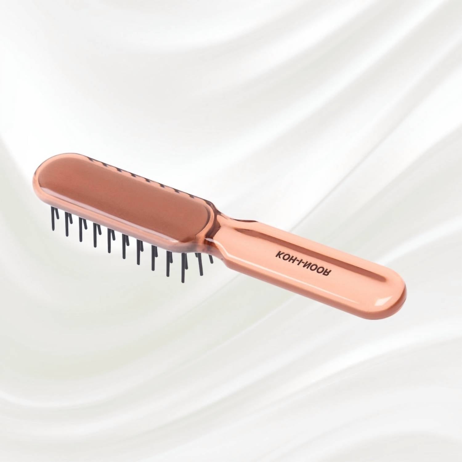 Introducing the Women's All Season Synthetic Bristle Hair Brush by Koh-I-Noor Beauty USA, a must-have for taming hard-to-style hair. This brush features cylindrical nylon pins set in a unique rubber pad to smooth thick, coarse locks effortlessly. With a rubber base that withstands high temperatures, it's perfect for prolonged use with a hair dryer. Available in sizes small (16x2.5cm) and large (20.5x4cm), and available in the vibrant color of Rose Pink.
