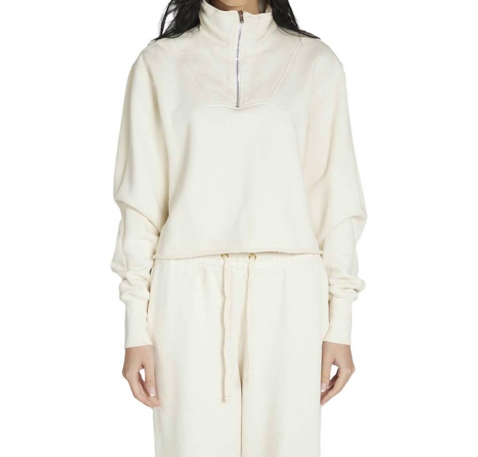 Stay warm and stylish in this versatile and effortlessly cool knitwear staple. Wear it alone or layered, it's the perfect sweater for the season and you'll wish you had it in every color. Discover the Haley Crop Half Zip Pullover Sweater by LES TIEN, an ivory masterpiece crafted for timeless elegance. Featuring long sleeves and a luxurious 100% cotton composition, this vintage structured fleece piece boasts a cropped, boxier fit that sits on or above the waistline. Proudly made in the USA, it incorporates a Riri zipper closure with distinctive reverse outer stitching and a raw bottom edge. Care for this garment with a machine wash on a gentle cycle and tumble dry on low, using a warm iron as needed.