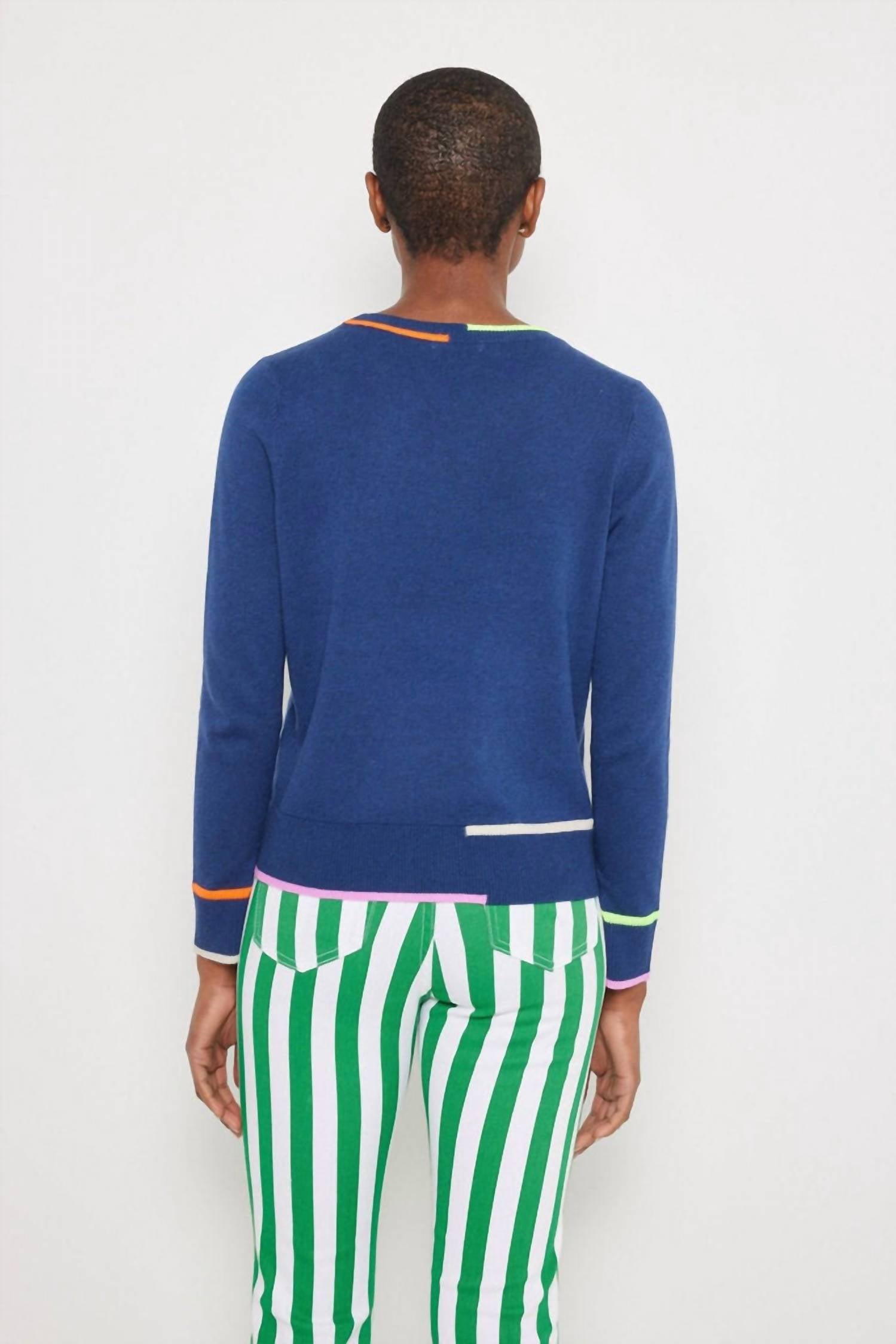 Stay warm and stylish in this versatile and effortlessly cool knitwear staple. Wear it alone or layered, it's the perfect sweater for the season and you'll wish you had it in every color. Meet the In Line Crew Neck Sweater by LISA TODD, a preppy essential in Blue Galaxy. With long sleeves and crafted from 100% cotton, this textured sweater offers a luxurious feel. It features multi-contrast trim details at the neck, cuffs, and hem, adding a stylish touch. Originating from an unspecified location, it is designed with a pull-on closure and requires machine washing. The model wearing a size small is 5'9" tall.