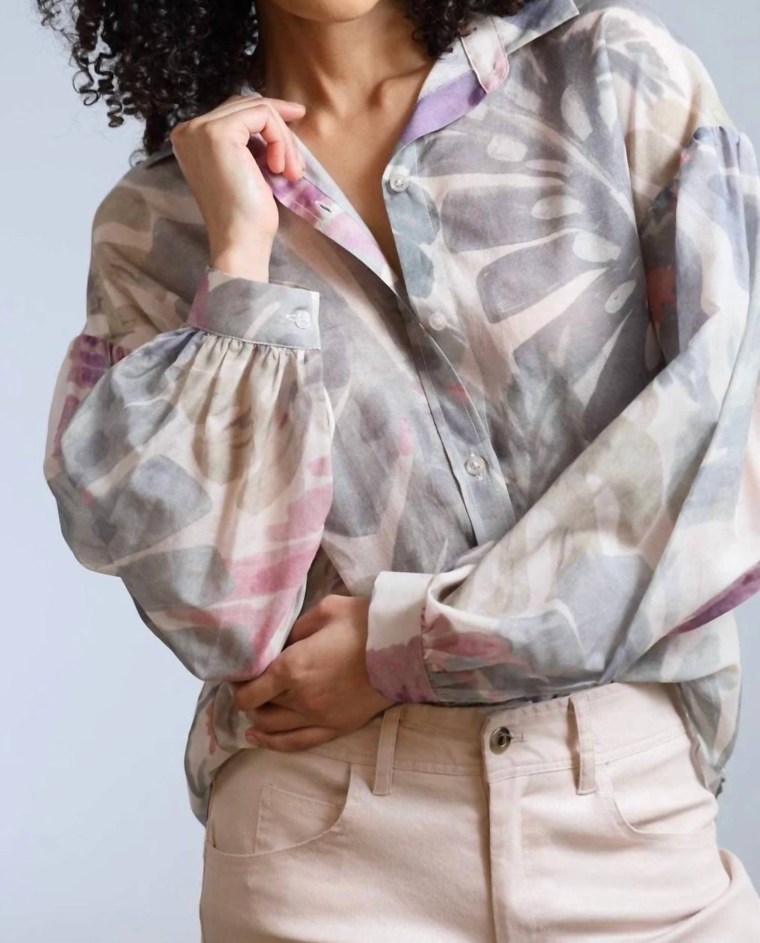 Elevate your vacation wardrobe with the Women's Palm Leaf Voile Shirt by Lola & Sophie. This blouse features long sleeves and is crafted from a luxurious blend of 73% cotton and 27% silk, offering a delicate floral pattern inspired by nature. The beige shirt, made with lightweight voile fabric, comes with a classic collared neckline and a button closure for added elegance. Care: Machine wash cold, hang to dry with dry cleaning as an optional care method. Model is 5'8" and is wearing size S.