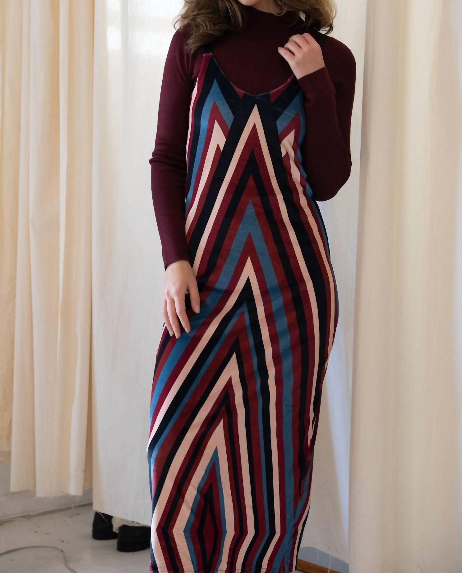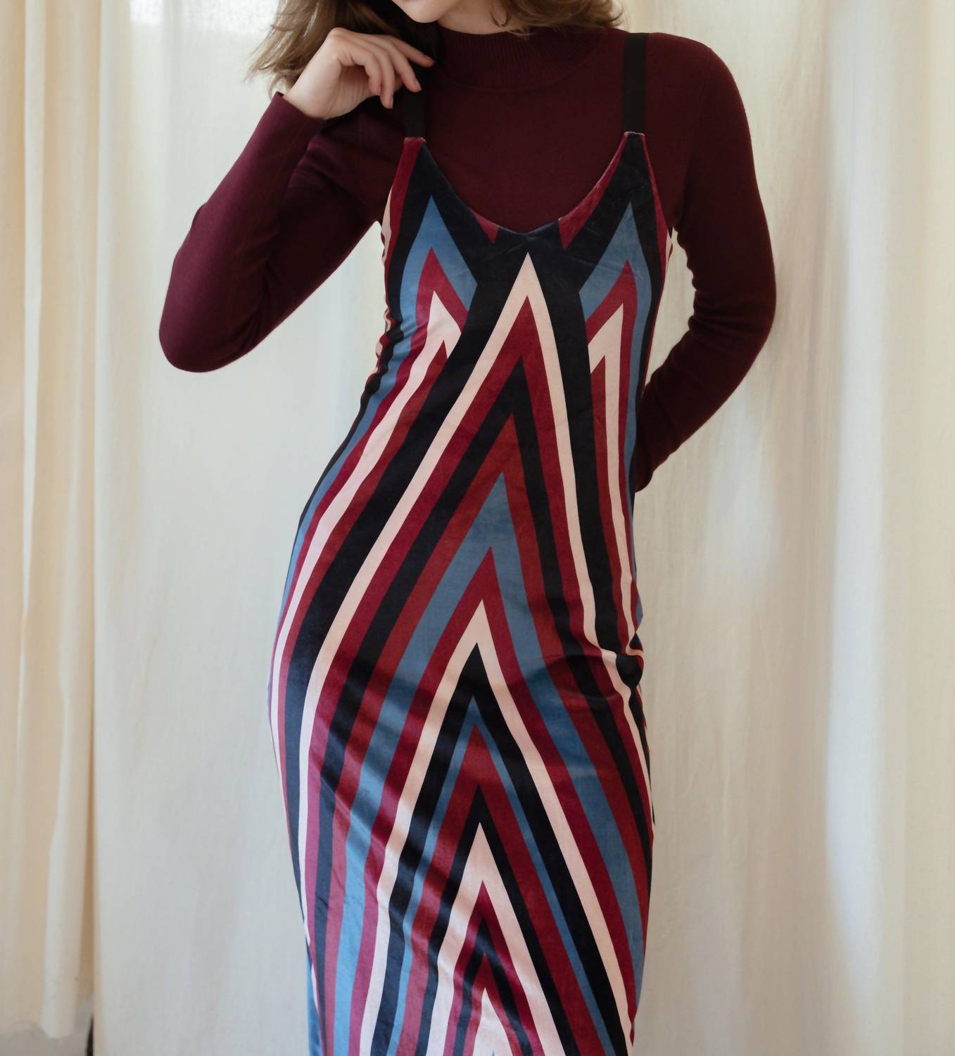 Who doesn't love a good maxi dress? This one you'll be reaching for season after season. Discover the Velour Striped Pinafore Dress by MIMA ROSSO, a captivating choice for spring engagement occasions. Crafted in a bodycon silhouette with spaghetti straps, this dress showcases a stylish scoop neckline. It features a multi-color striped pattern, enhancing its maxi-length design with a vibrant flair. Closure: Pull on.