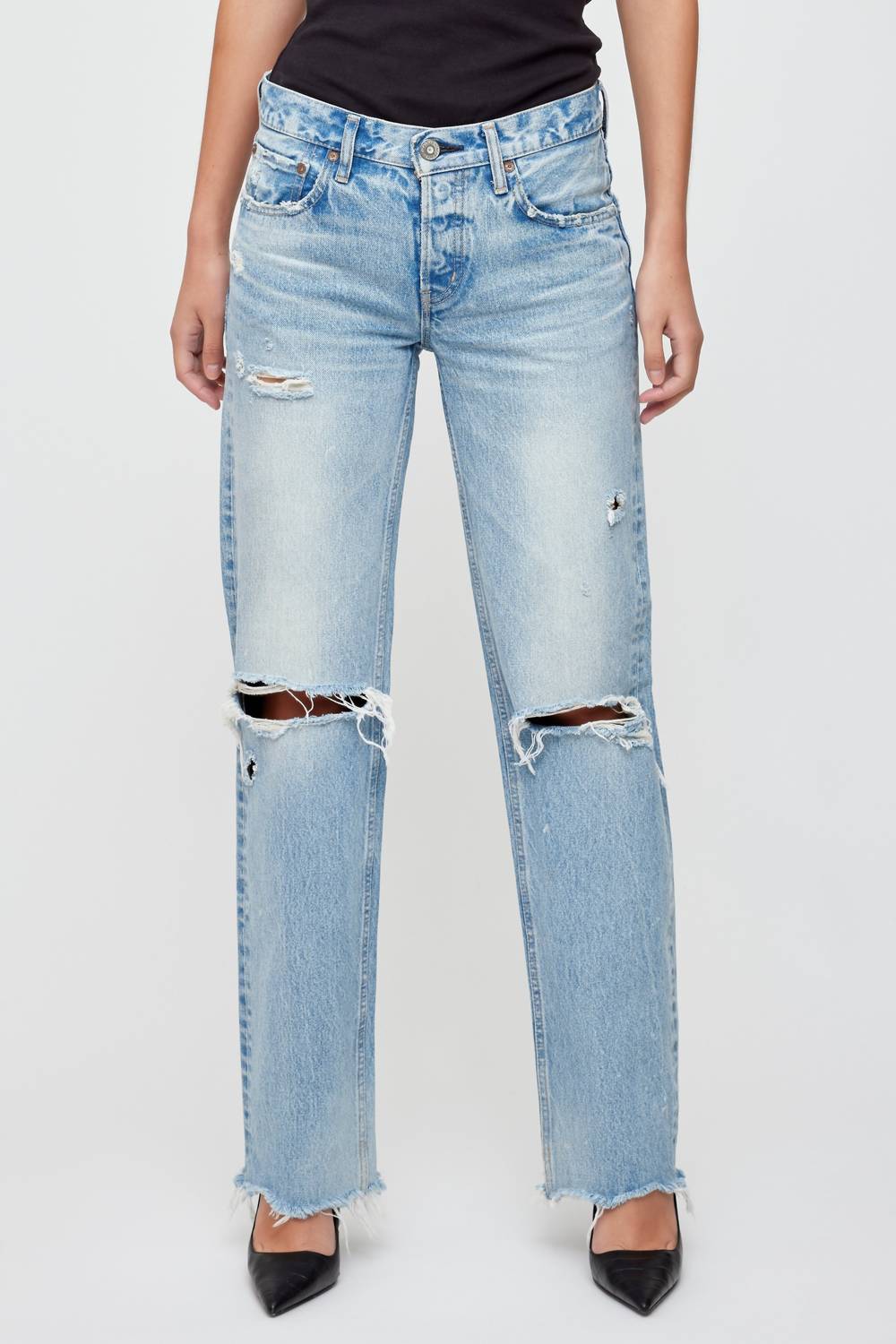 Explore the Odessa Straight-low Pants by Moussy, crafted in Japan for a chic minimalist summer look. These stylish pants feature a low-rise, full-length silhouette with a slim, straight leg and a light wash plaid & check pattern. Made from medium-weight 100% cotton with cowhide leather labels, they ensure quality and comfort. Closure: Button fly. Care: Machine wash cold on delicate cycle, do not bleach or tumble dry; hot iron with a press cloth, and do not dry clean. Model is 175cm/5'9" and wears size 25.