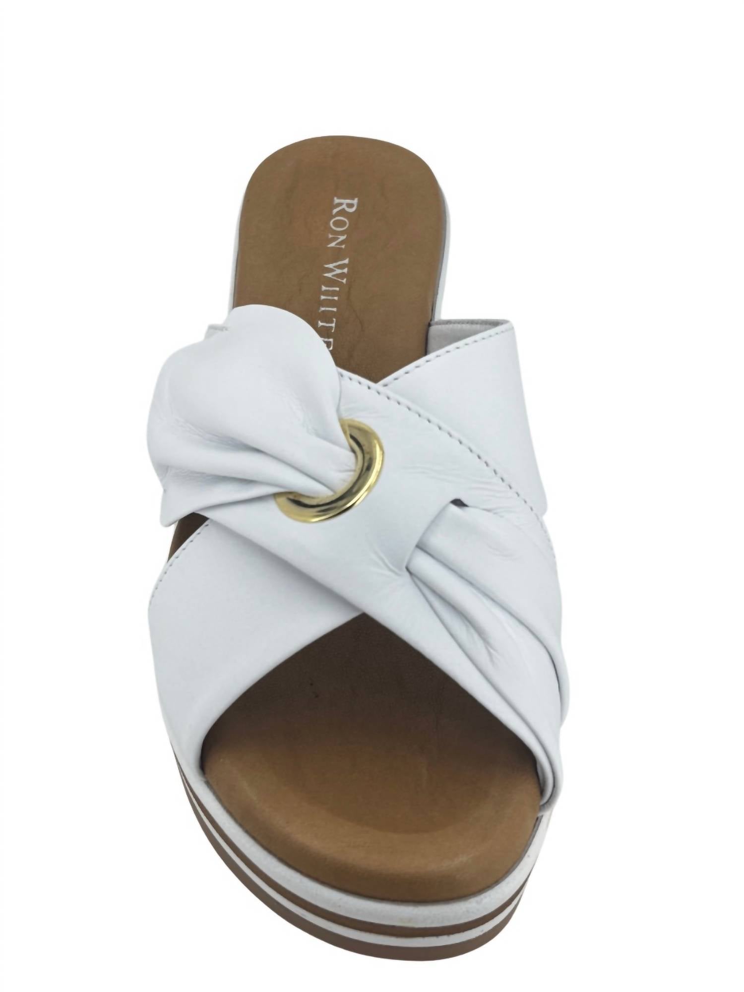 The Patrika Platform Wedge Slide Sandal by Ron White combines modern style with all-day comfort, handcrafted in Italy from premium materials. Designed with sleek crisscross vamp straps accented by gleaming grommet details, these sandals bring a touch of elegance to any look.