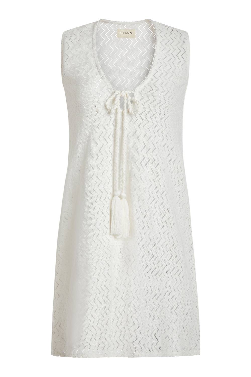 You're go-to coverup for pool parties, beach days and long weekends. Chic coverup perfect for a sunny beach day. Designed in an eye-catching patterned crochet material. Features a deep V-neck and a front tie for optional coverage, effortlessly embodying boho chic style. Ideal for summer, pair it with sandals and a sun hat for a standout vacay outfit. Care instructions recommend machine washing for easy upkeep.