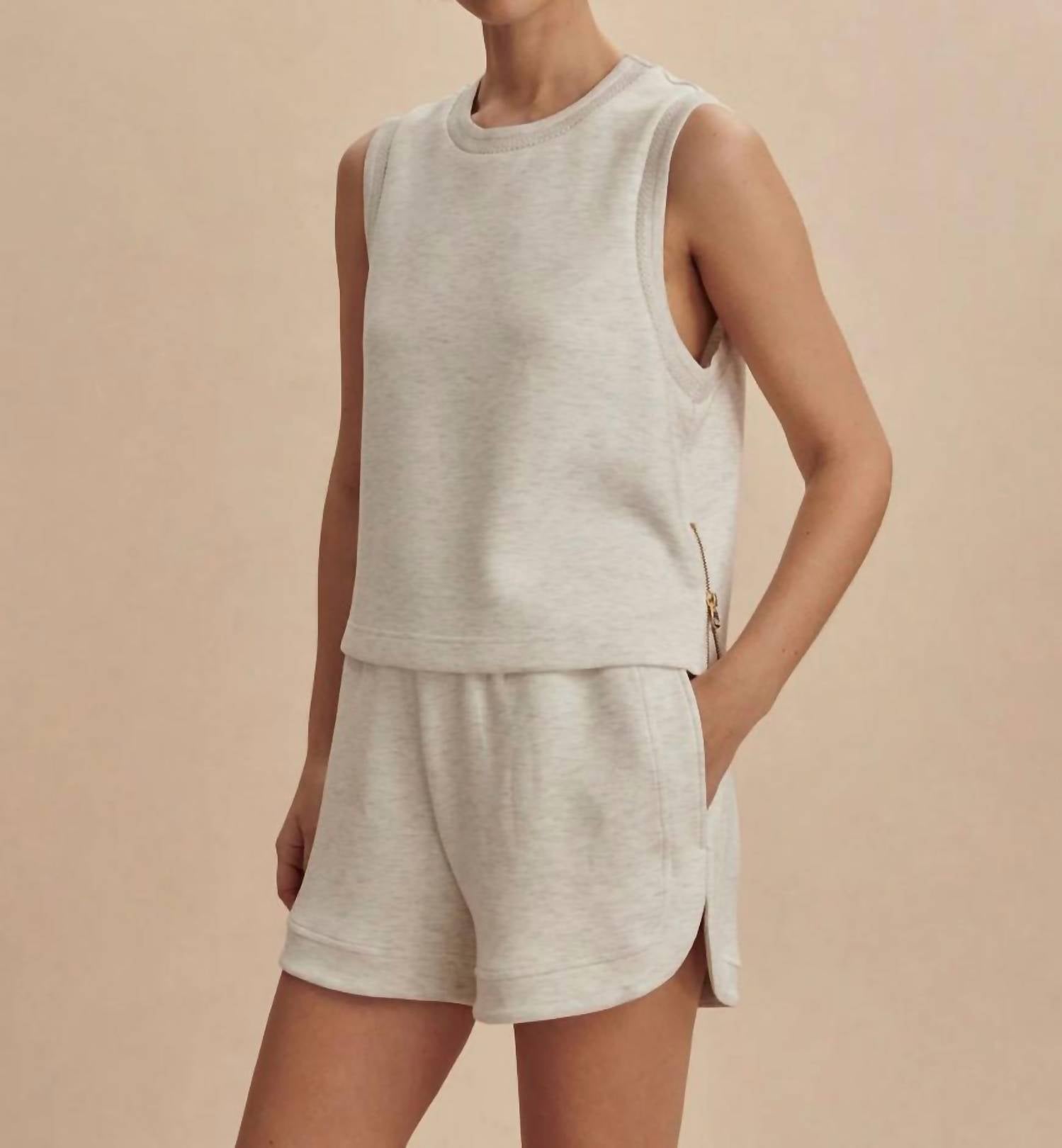 The perfect tank top for those warmer weather seasons. Explore effortless summer style with the Shea Crop Tank by VARLEY in a chic Ivory Marl. This sleeveless design is made from a luxurious blend of 81% Viscose, 15% Polyester, and 4% Elastane, featuring a timeless crew neck with detailed pointelle knitted trims, complemented by exposed side zips for an edgy touch. Crafted for comfort and style, it utilizes the signature DoubleSoft® fabric, making it the ideal choice for a minimalist vacation look. Closure: Pull on. Care: Machine wash cool, lay flat to dry.