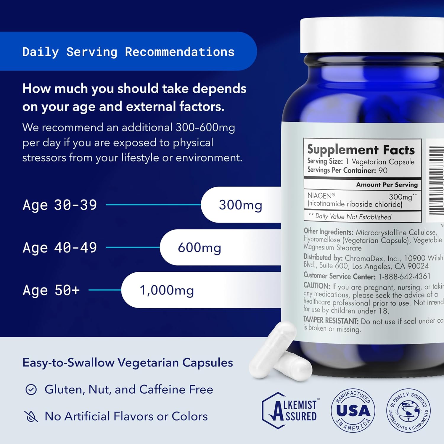 • High-Quality Niagen: Each serving contains 300mg of Niagen, a patented form of Nicotinamide Riboside (NR), a unique form of Vitamin B3.