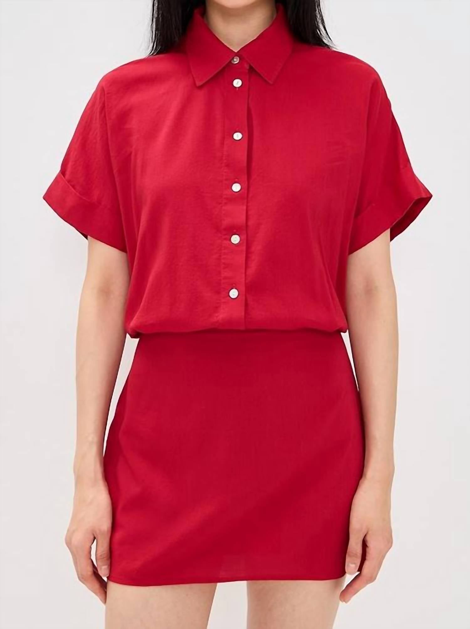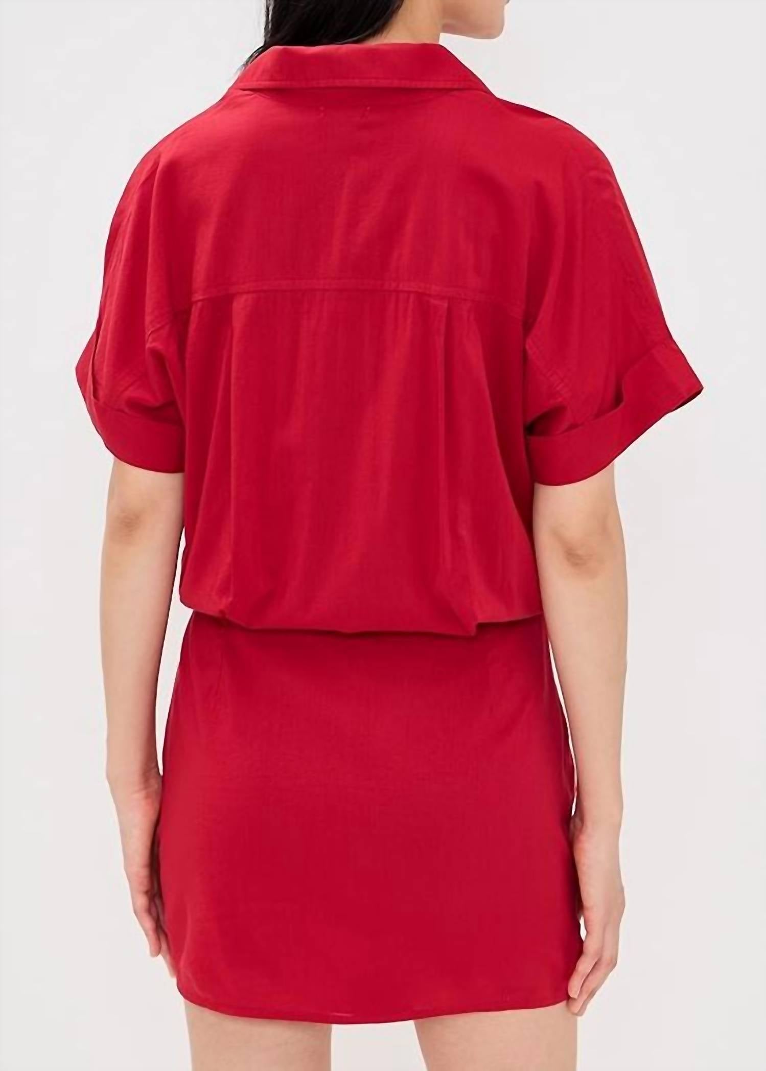 Introducing the Blythe Shirt Dress by PISTOLA, a stylish mini in eye-catching Samba, perfect for back-to-school or a chic workwear look. This cotton blend piece from China features cuffed short sleeves and a collared neck, with a fitted silhouette that flatters. The dress is designed with a button closure and measures 35.5 inches in length from the shoulder, showcasing a solid pattern that pairs well with any accessory. Care for this lightweight stretch weave by washing cold for enduring wear.