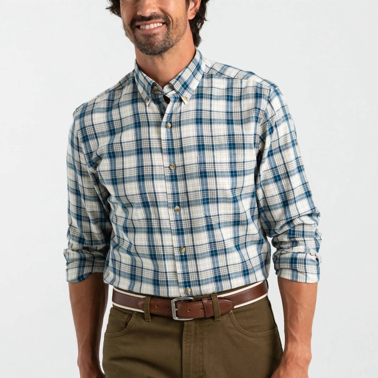Introducing the Twill Sport Shirt Holling Plaid by DUCK HEAD, a sophisticated yet casual piece in Mirror Lake Blue perfect for vacation or regular outings. This men's shirt features long sleeves and a button-down collar, crafted from a premium cotton blend of 90% cotton and 10% lambswool twill. It showcases standout details like fisheye horn buttons and a left chest pencil pocket. Enjoy the subtle elegance of its plaid design with a quiet luxury vibe.