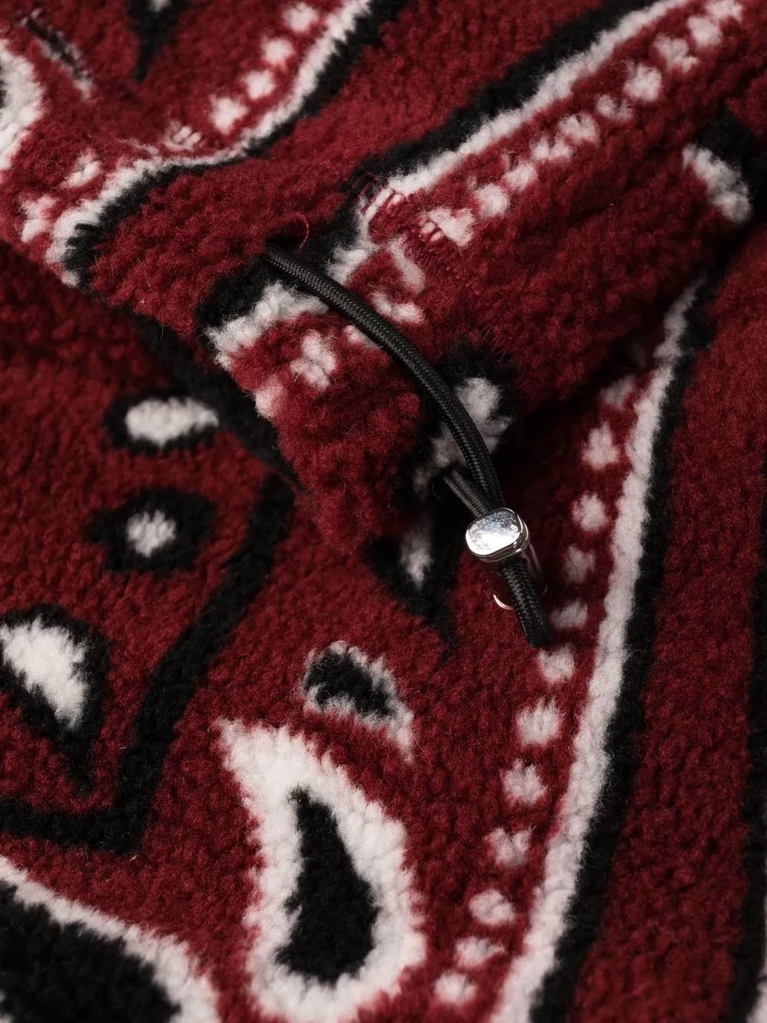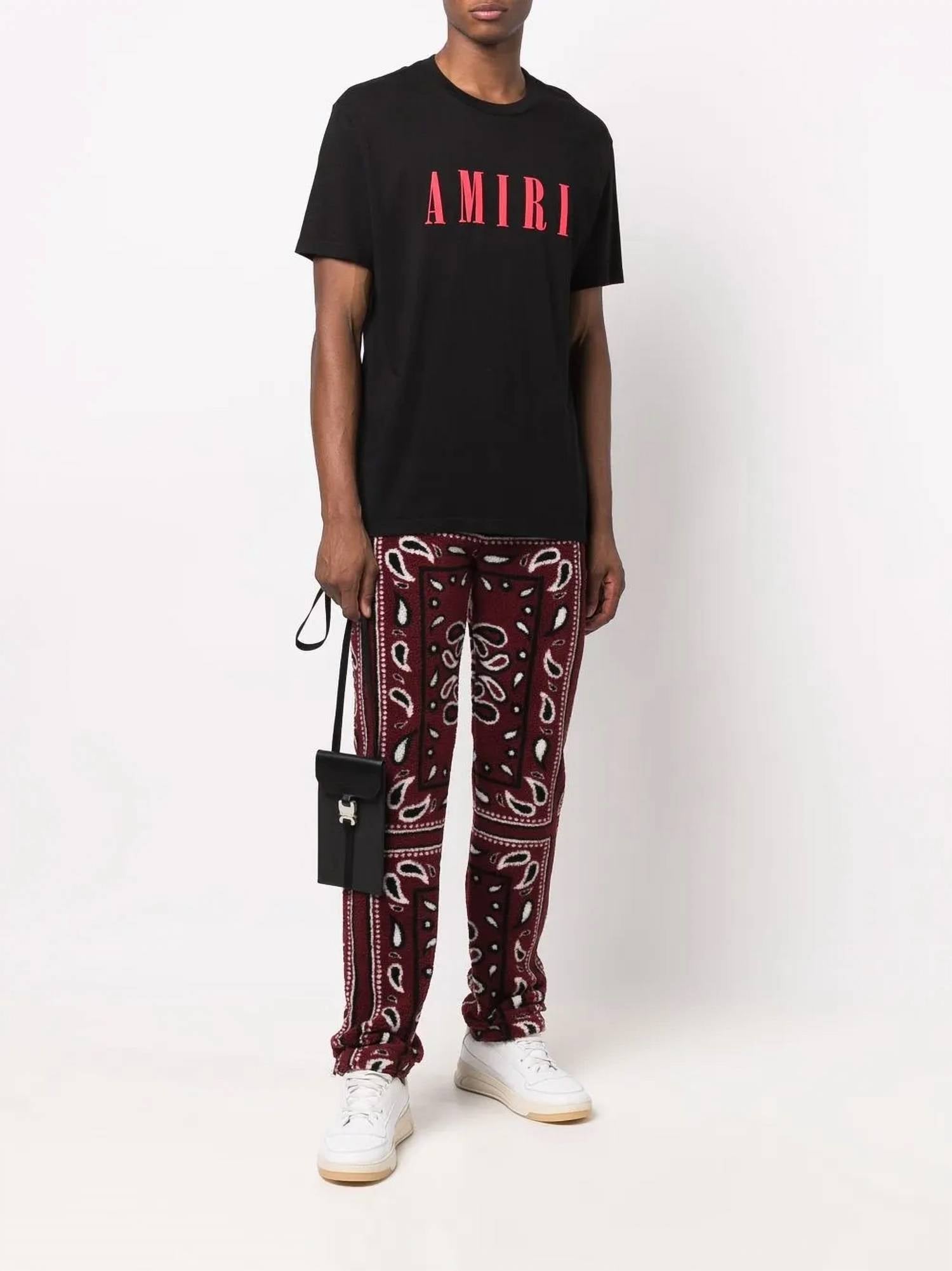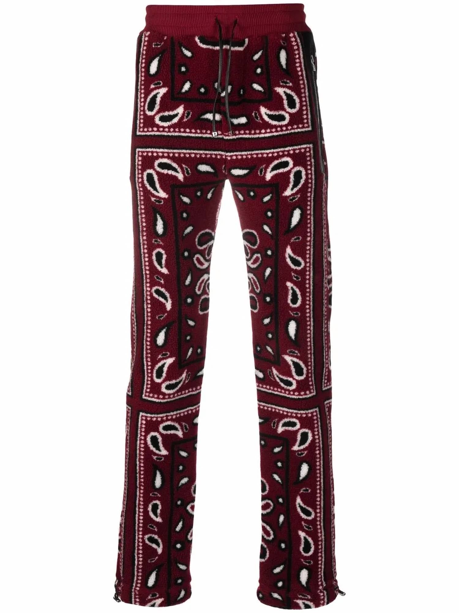 Introducing the Printed Bandana Fleece Pants by Amiri, designed to make a bold statement in vibrant red with a paisley bandana print. Crafted from cotton, these comfort fit pants boast a straight leg style and a practical elasticated drawstring waistband. Made in Italy, they feature a rear patch pocket and two side zip-fastening pockets for added convenience. Composition: 100% Cotton. Closure: Pull on. Care: Dry clean only.
