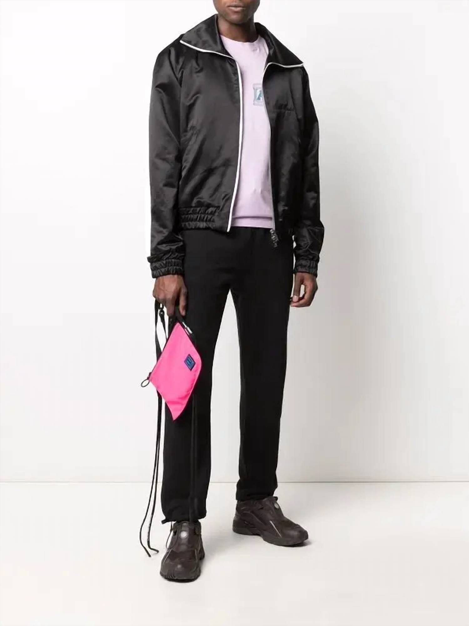 Discover the Zip Track Stripe Jacket by Amiri, an ideal choice for a minimalist winter style. Crafted from a cotton blend, this jacket boasts long sleeves and a high neck, with side stripe detailing adding a sporty touch. It features a front zip closure, embroidered logo at the chest, and a logo patch to the rear, complete with two side slit pockets, elasticated cuffs, and an elasticated hem. Perfect for a holiday party, this jacket is best cared for with dry cleaning.