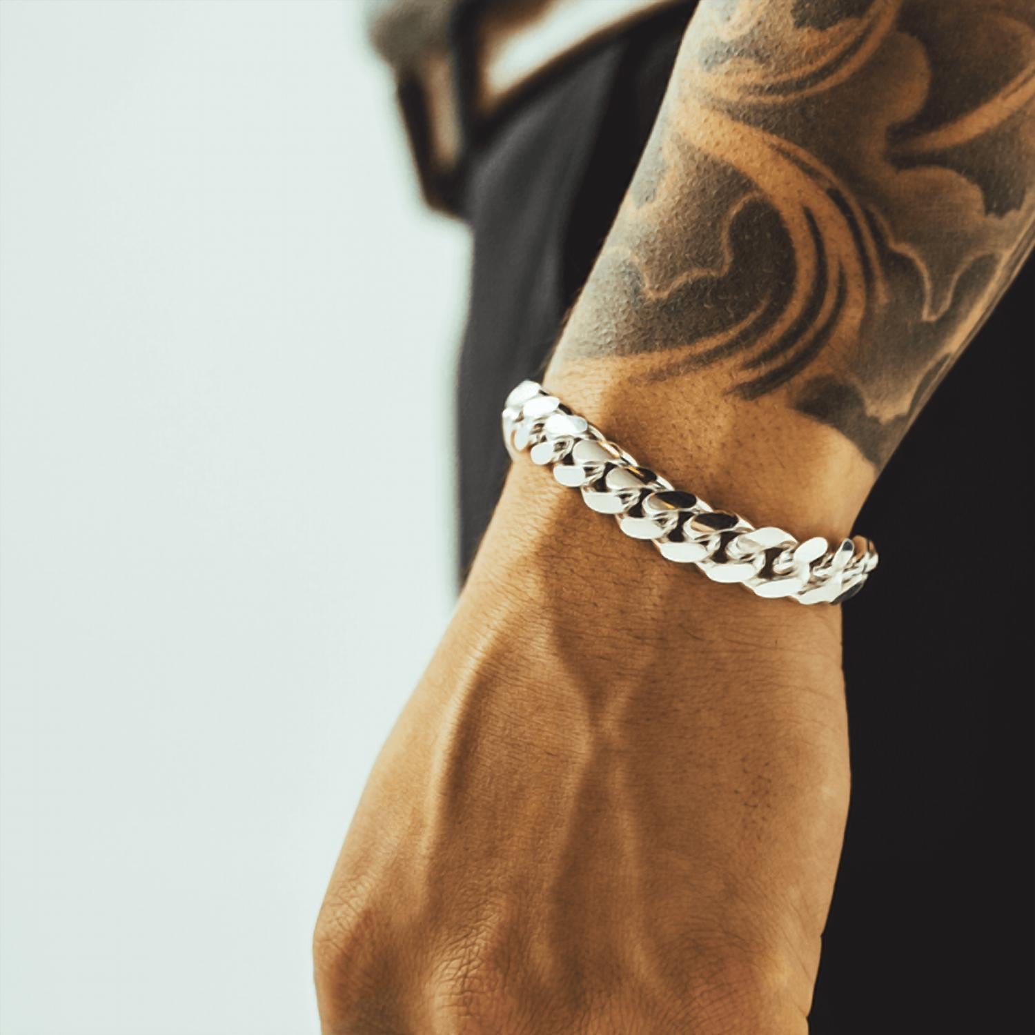 Make a bold statement with the Men's Cuban Link Bracelet by Eklexic, a fusion of timeless design and modern flair. Featuring a robust 9.81mm wide and 2.8mm thick rounded curb chain, this piece is meticulously crafted from sustainable recycled brass with a sleek Rhodium-Silver plated finish. Available in various lengths from 7" to 12", this bracelet is secured with a durable, 15mm lobster clasp for effortless style and lasting durability. Choose this jewelry piece for its sustainable strength and versatile elegance.