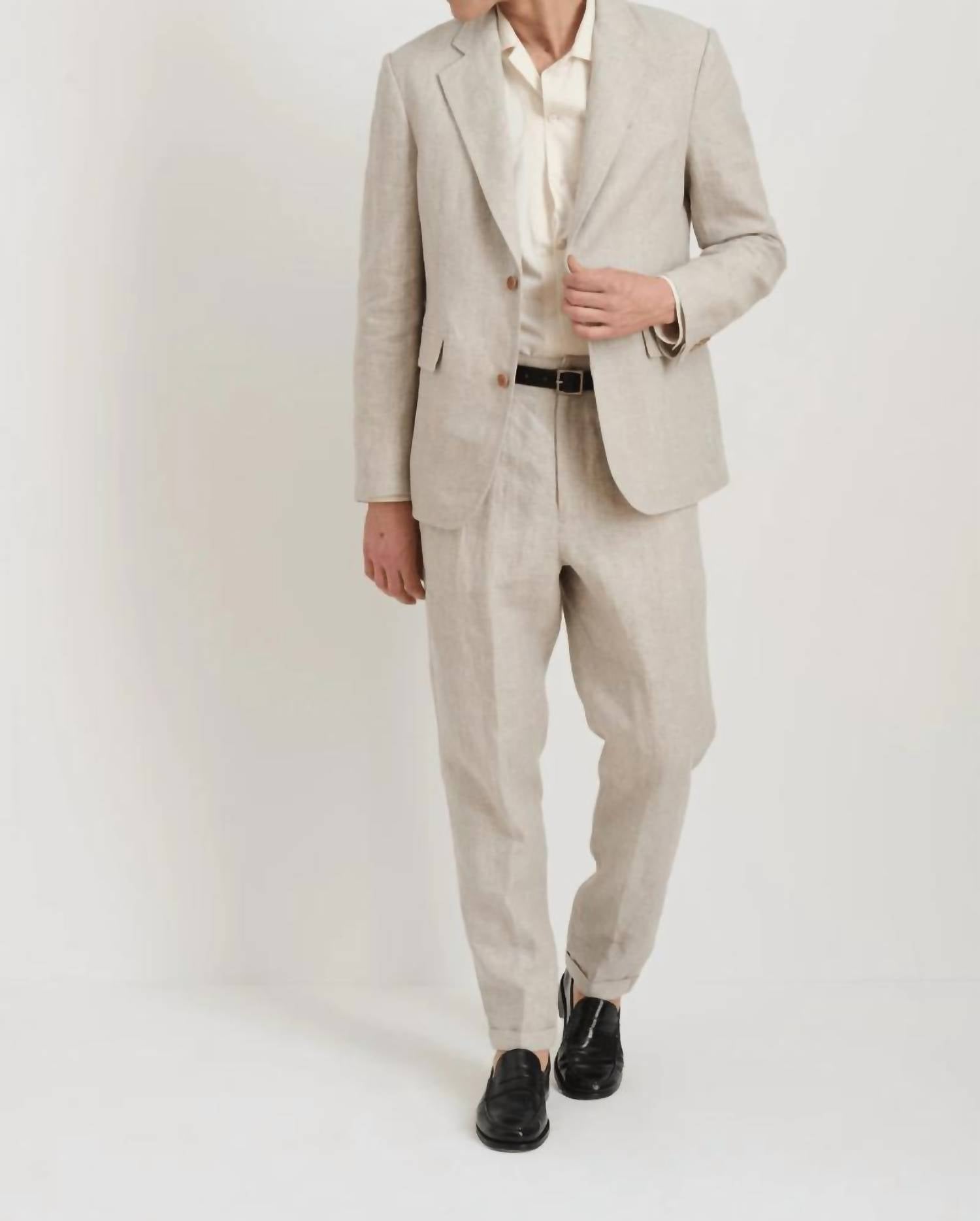 Meet the Cooper Blazer by Alex Mill, your go-to for a sophisticated, breathable look in Flex Linen. This men's blazer features long sleeves and is composed of 100% flax linen with a half cotton lining, ensuring maximum breathability and comfort in warmer climates. This solid pattern blazer boasts corozo buttons with a contrast backer, offering a touch of understated luxury. Designed with a collar neckline, you're advised to dry clean this timeless piece to maintain its crisp look.