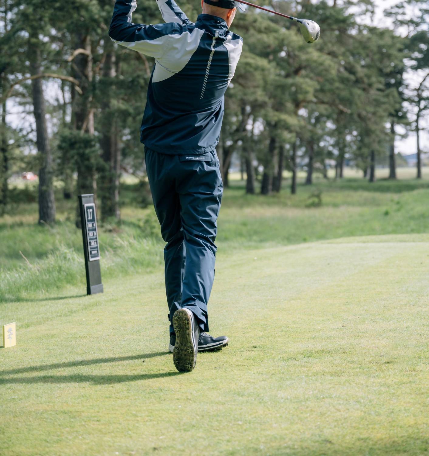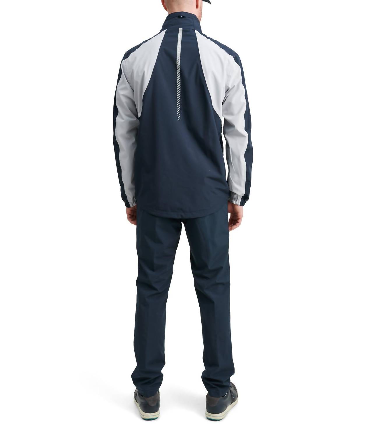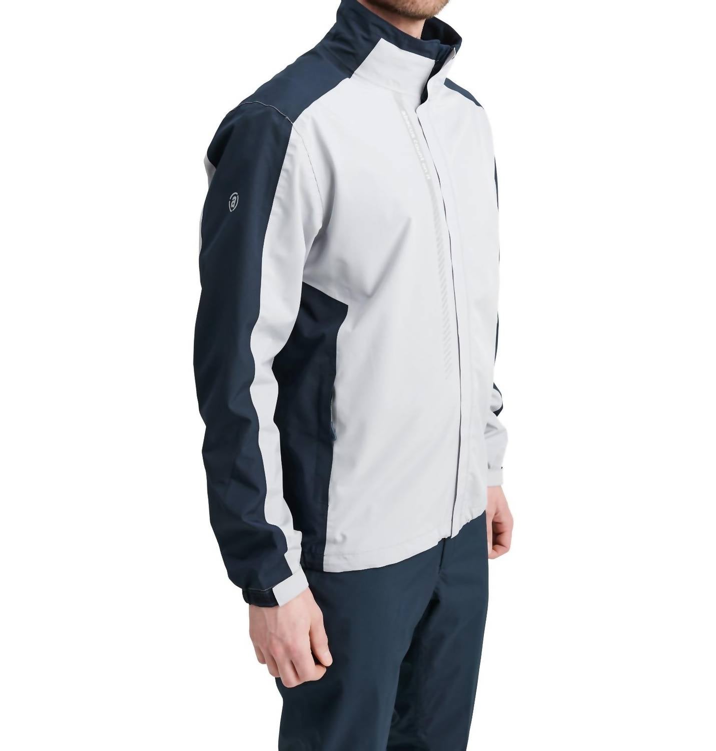 The Links Stretch Golf Rain Jacket by Abacus Sportswear US is designed for optimal performance in changing weather conditions. This men's lightweight jacket features long sleeves and a mockneck closure, crafted from breathable polyester with a solid pattern in a versatile navy and light grey color. It sports a convenient zip closure, lined with features like taped seams and adjustable cuffs for added comfort, and includes practical zippered side pockets. Ideal for game day, this athleisure piece requires machine washing and line drying for care.