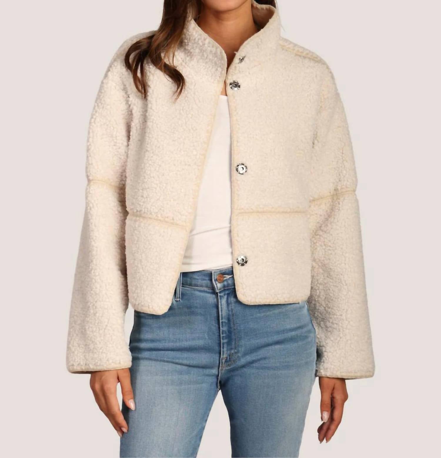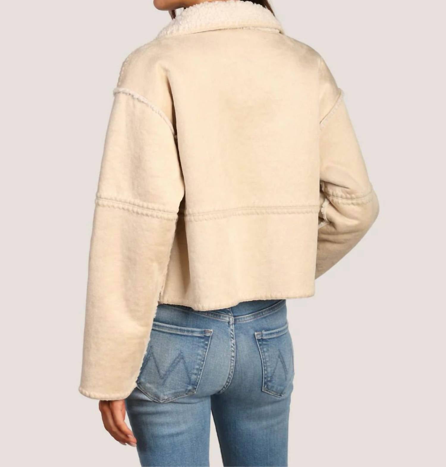 Introducing the Dylan Casey Stitched Jacket, a fusion of luxury and warmth designed for the modern wardrobe. This women's jacket features long sleeves and is crafted from 100% polyester, offering a faux suede and sherpa texture for a sophisticated look. It comes in a solid natural color and boasts a snap closure for easy wear. Ideal for winter outings or a New Year's Eve dinner party, this versatile bomber-style piece requires minimal maintenance.