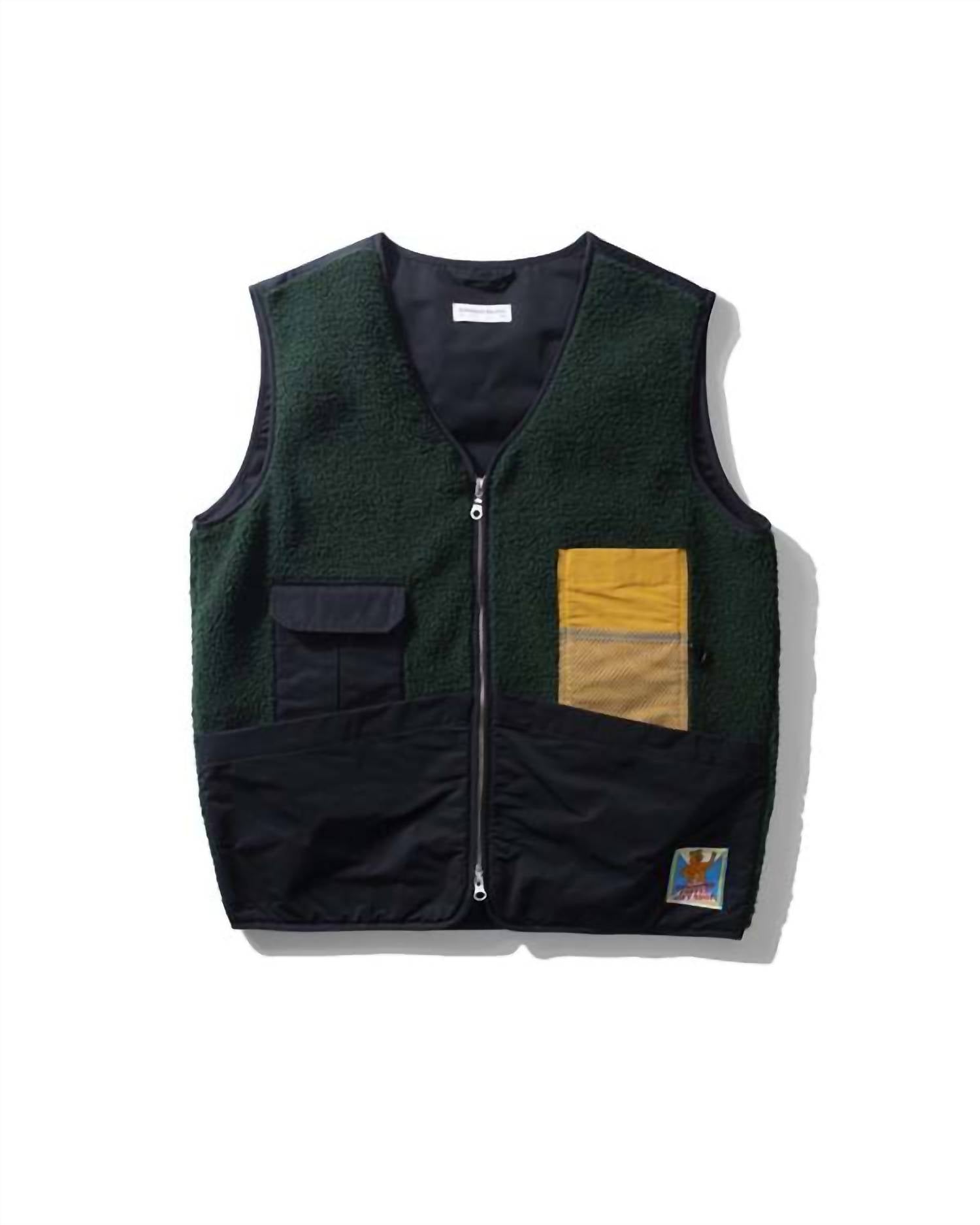 Presenting the Shearling Vest by Edmmond Studios, a stylish and minimalist choice for the spring season. This sleeveless vest in dark green is crafted from 100% polyester with a solid pattern, featuring a crewneck and a frontal metallic zip closure. Designed without a lining, it includes two pockets for convenience. Care: Machine wash and tumble dry.