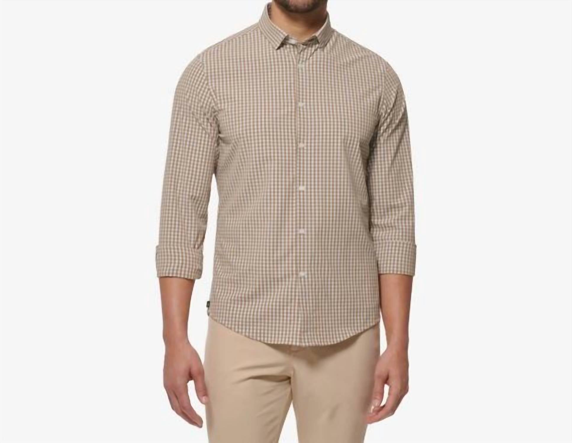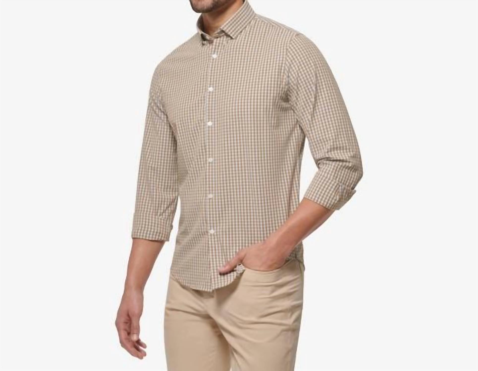 The Leeward No Tuck Dress Shirt by Mizzen + Main is a stylish choice for any occasion, presented in a golden brown gingham pattern. This shirt features long sleeves and a hidden button-down collar, crafted from a blend of 88% polyester and 12% spandex, offering superior quick-dry properties, wrinkle resistance, and 4-way stretch. With a no-tuck design, it is 2 inches shorter in the body to hit mid-zipper for a modern fit. Closure: Button closure. Care: Machine wash cold, inside out, and hang to dry.