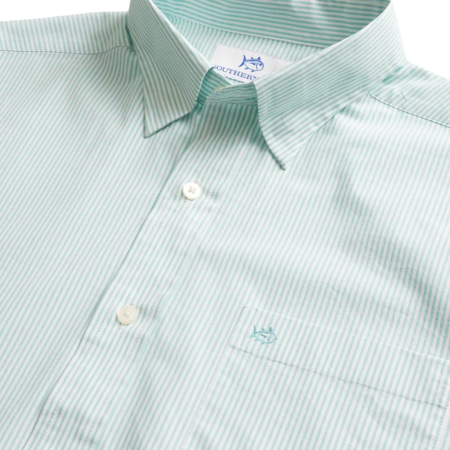 Introducing the Charleston Granby Stripe Long Sleeve Sport Shirt by Southern Tide, a classic addition to any preppy wardrobe. Designed with a long sleeve and created from a cotton blend, this shirt features a sophisticated blue and white pinstripe pattern. The button closure enhances the timeless look, while the pocket detail adds functionality. For convenient care, this sport shirt is machine washable and can be tumble dried, making it perfect for spring dinners and holiday gatherings.