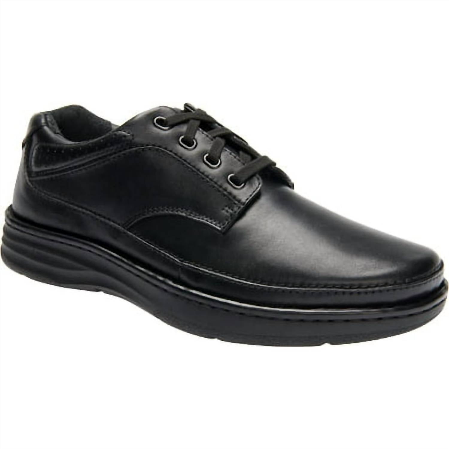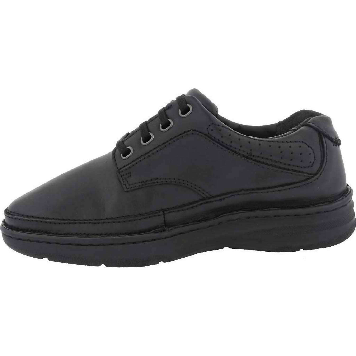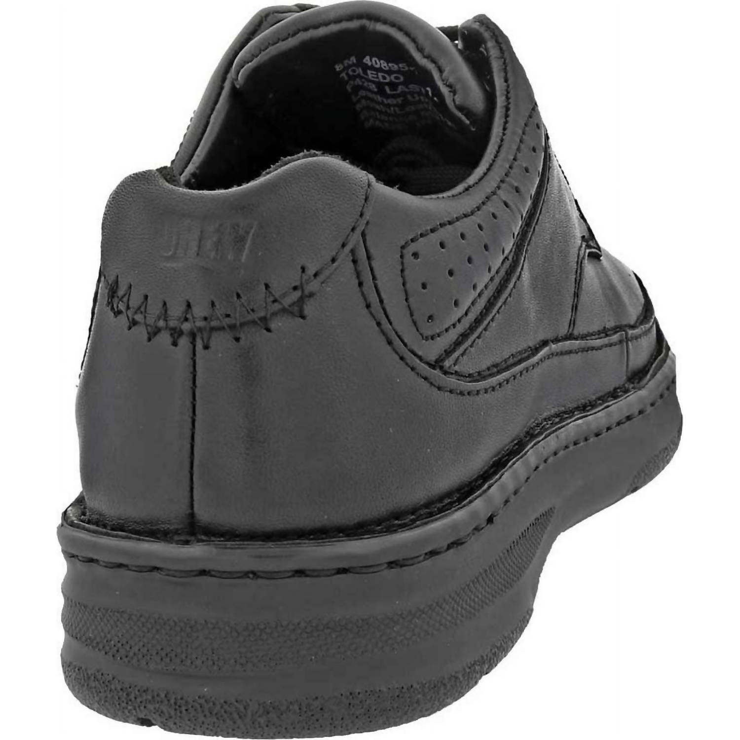 Introducing the Men's Toledo Casual Shoes by Drew Shoes, the epitome of style and comfort in sleek Black Calf leather. This pair is thoughtfully designed with Drilex® and leather lining, offering a round toe shape and plush, foam-padded tongue and collar for all-day wearability. Experience unparalleled support and stability with its tempered steel shank and Opanka construction, complemented by a lightweight polyurethane outsole with a rocker bottom. Enjoy the versatility of the Plus Fitting System® offering customizable depth with two removable footbeds, perfect for accommodating prescribed orthotics.