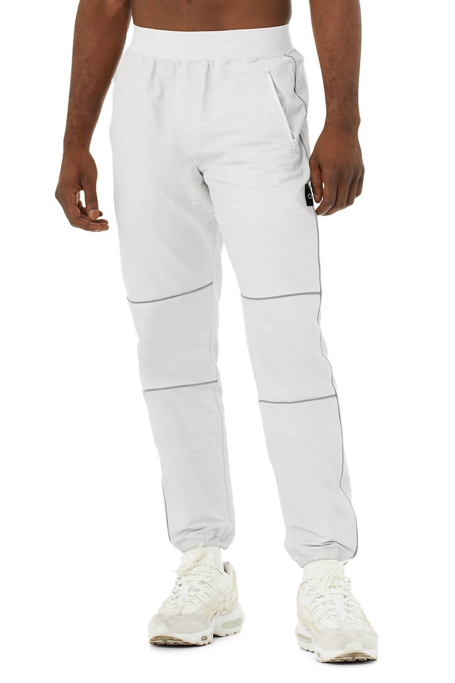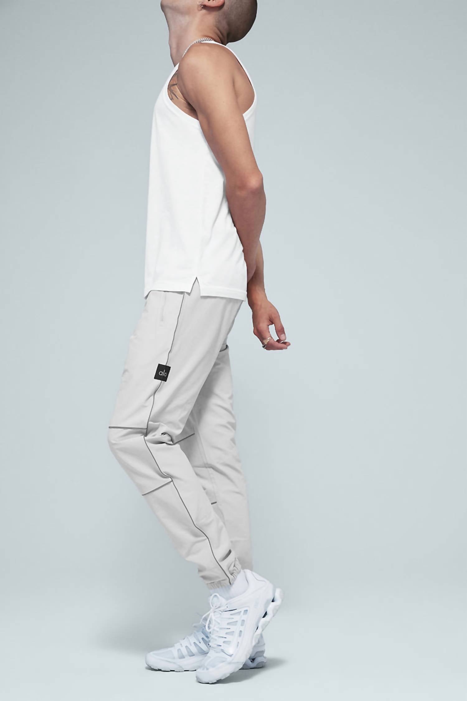 Introducing the Torrent Track Sweatpant by Alo Yoga, perfect for an active lifestyle or casual wear in a sleek Titanium shade. These sweatpants feature reflective piping details, a woven nylon shell, and a relaxed slim fit with tapered legs. Designed for convenience, they include zippered side and back pockets, an elastic waistband, and cinched cuffs, with inseam options up to 32.5". Pull-on style. Machine wash cold with like colors, tumble dry low, low iron, do not dry clean. 58% Cotton / 42% Nylon.
