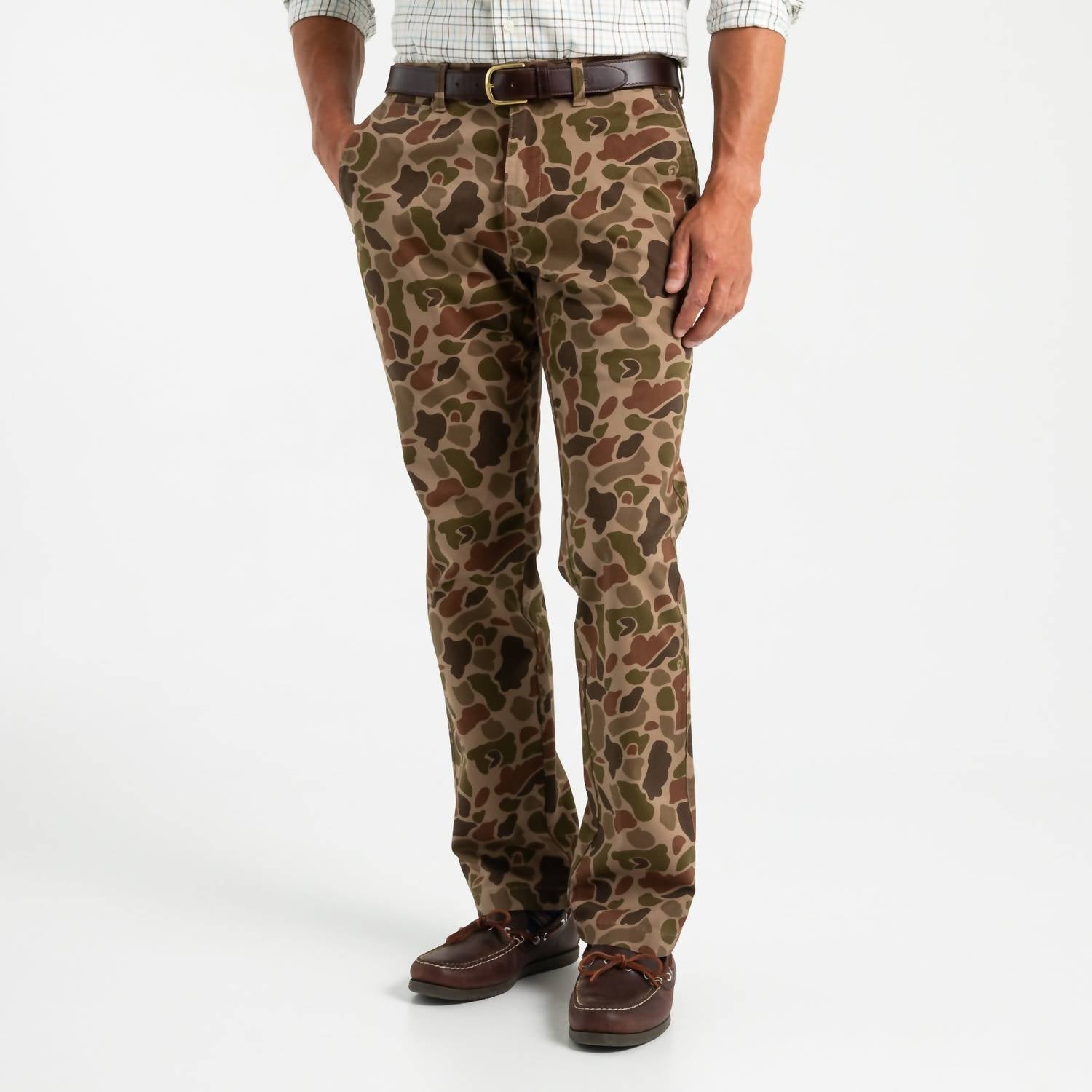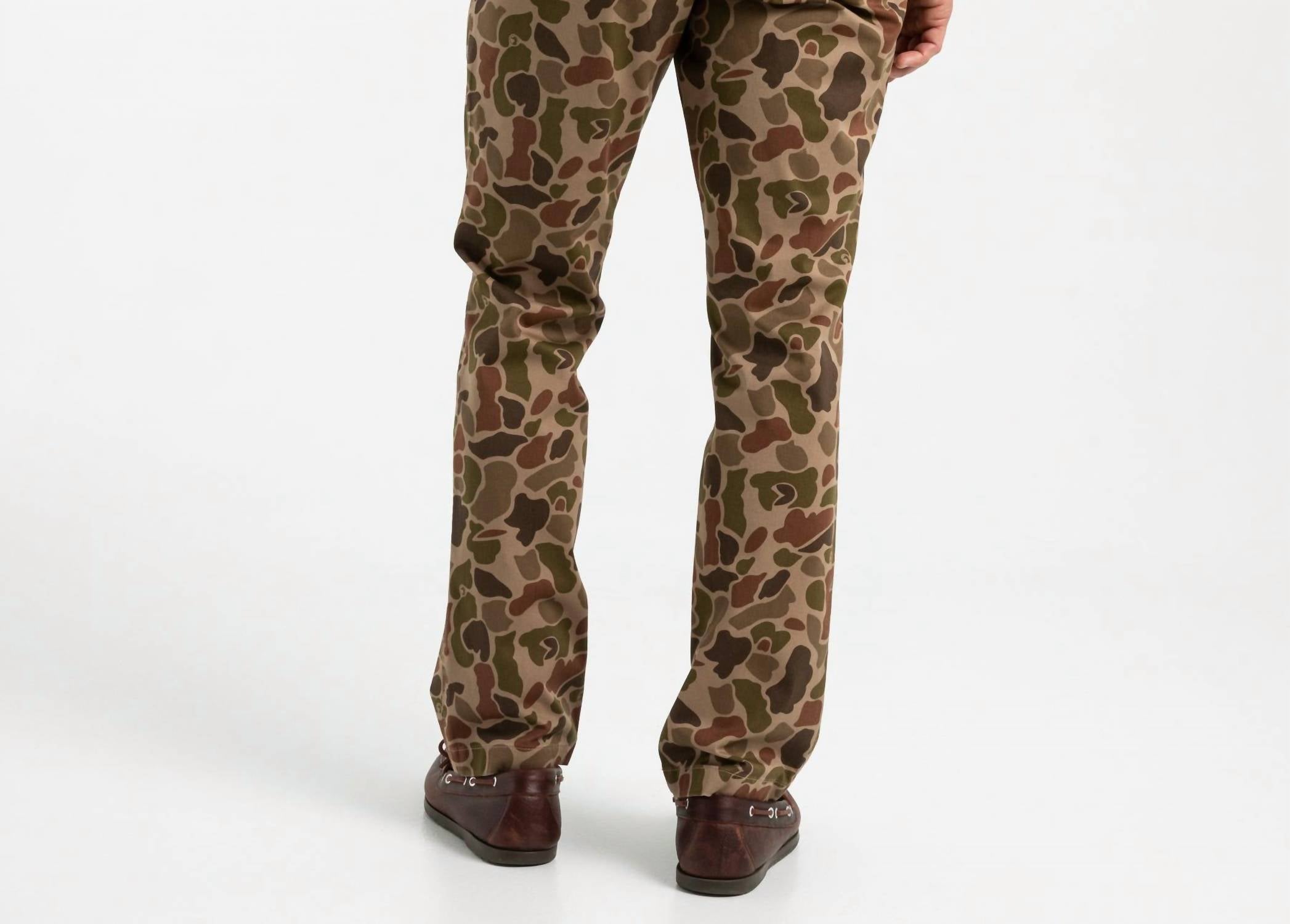 Discover the Gold School Chino Pants by Duck Head, crafted in toasted khaki camo for a preppy yet timeless look. With a regular fit and straight leg style, these chinos offer a balance of comfort and style, thanks to the 97% cotton and 3% stretch composition. Featuring a durable antique brass YKK zip closure and practical deep pockets, they are a reliable choice for any occasion. Care instructions include machine washing cold on a gentle cycle and tumble drying low.