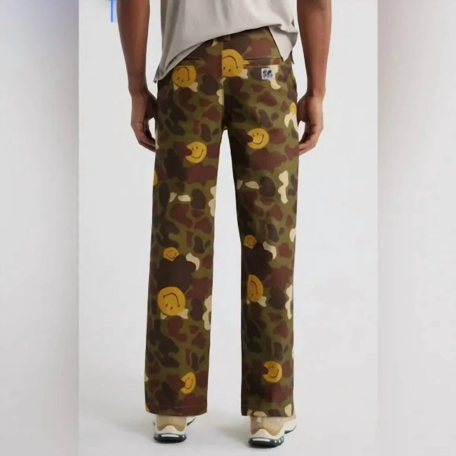 Discover the Hiding Camo Cotton Twill Workwear Pants by MARKET, where bright SMILEYs play hide-and-seek within a mossy camouflage pattern. Crafted from heavyweight 100% cotton twill, these relaxed-fit cargo pants boast a mid-rise waist and straight leg for ultimate comfort. Closure: Zip fly with button closure. Care: Machine wash and tumble dry. Imported and officially licensed by SMILEY, these pants capture the essence of LA streetwear fashion.