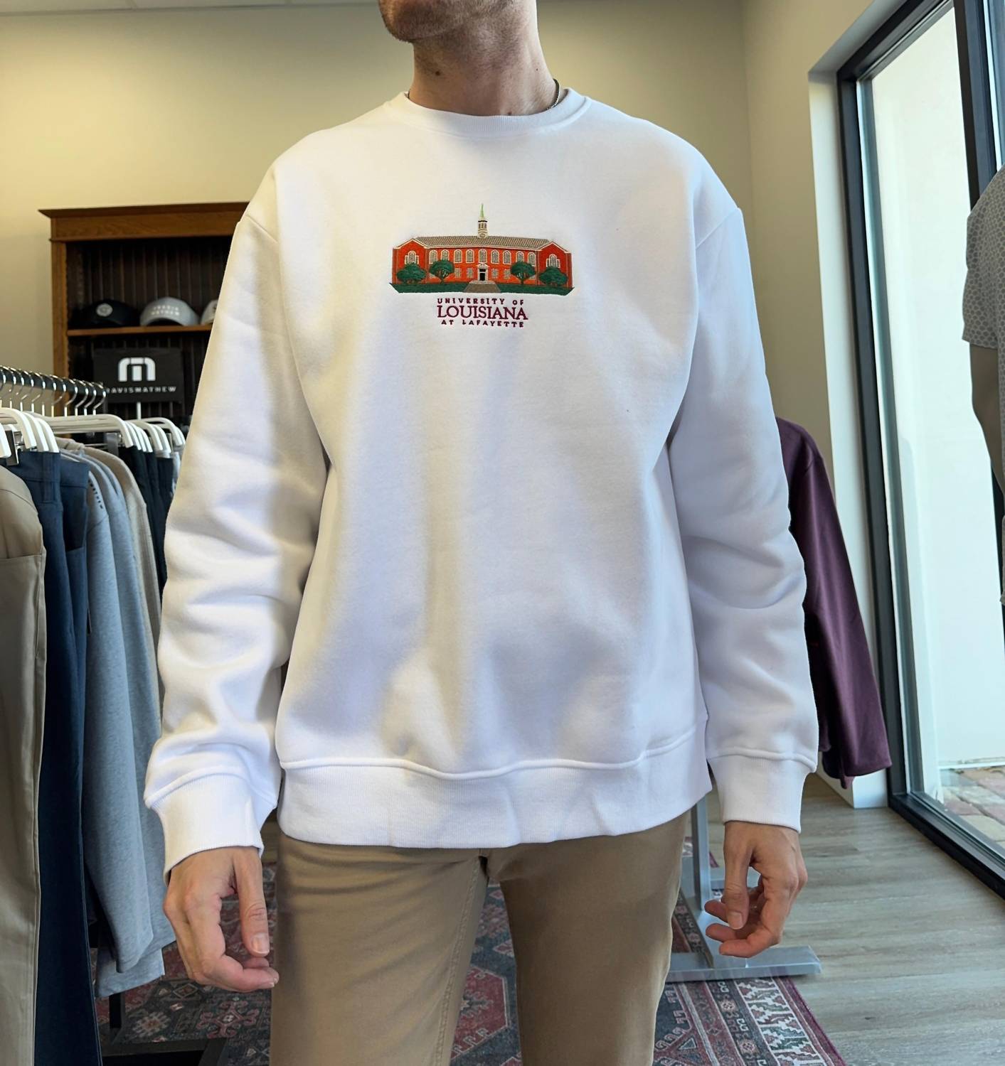 Embrace timeless style with the Ragin Cajun Crewneck Sweater by Traditions Collegiate Apparel. This vintage-inspired long sleeve crewneck comes in a striking white graphic pattern and is crafted from a comfortable cotton blend of 50% cotton and 50% polyester. Designed for a true-to-size fit, consider sizing up for a trendy oversized look. Care is straightforward: machine wash and lay flat to dry. Ideal for spring dinner parties or Thanksgiving gatherings, this sweater ensures classic elegance. Model is 5'11", 170 pounds, wearing a large.