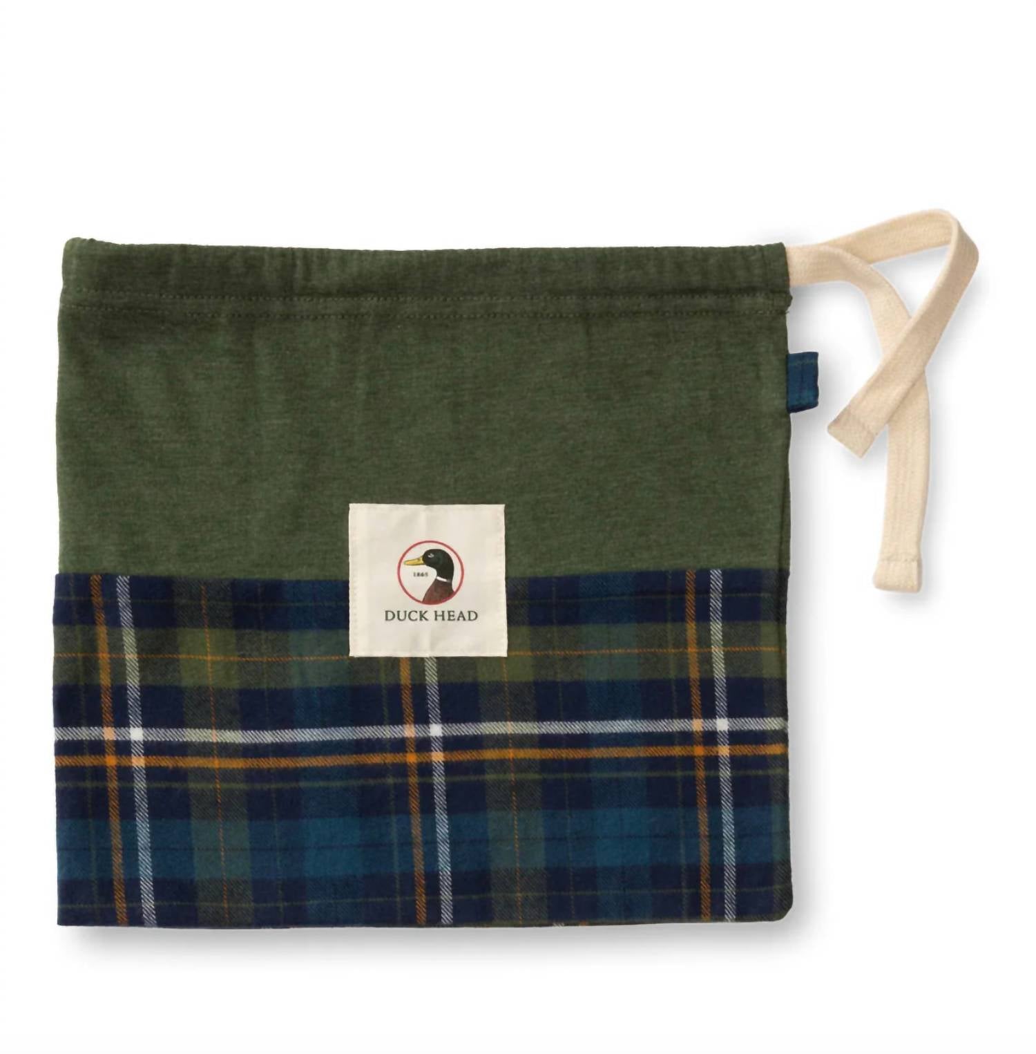 Experience ultimate relaxation in Pine Green, perfect blend of comfort and style. Includes an ultra-soft top made from 60% Cotton and 40% Polyester Knit Jersey, and cozy pants crafted from 100% Cotton Plaid Flannel. Featuring an elastic waistband with a drawstring and a 3-hole pearl button on the fly. Combines practicality with aesthetics. Ideal for gifting, comes in a matching drawstring bag, making it a versatile and thoughtful choice.