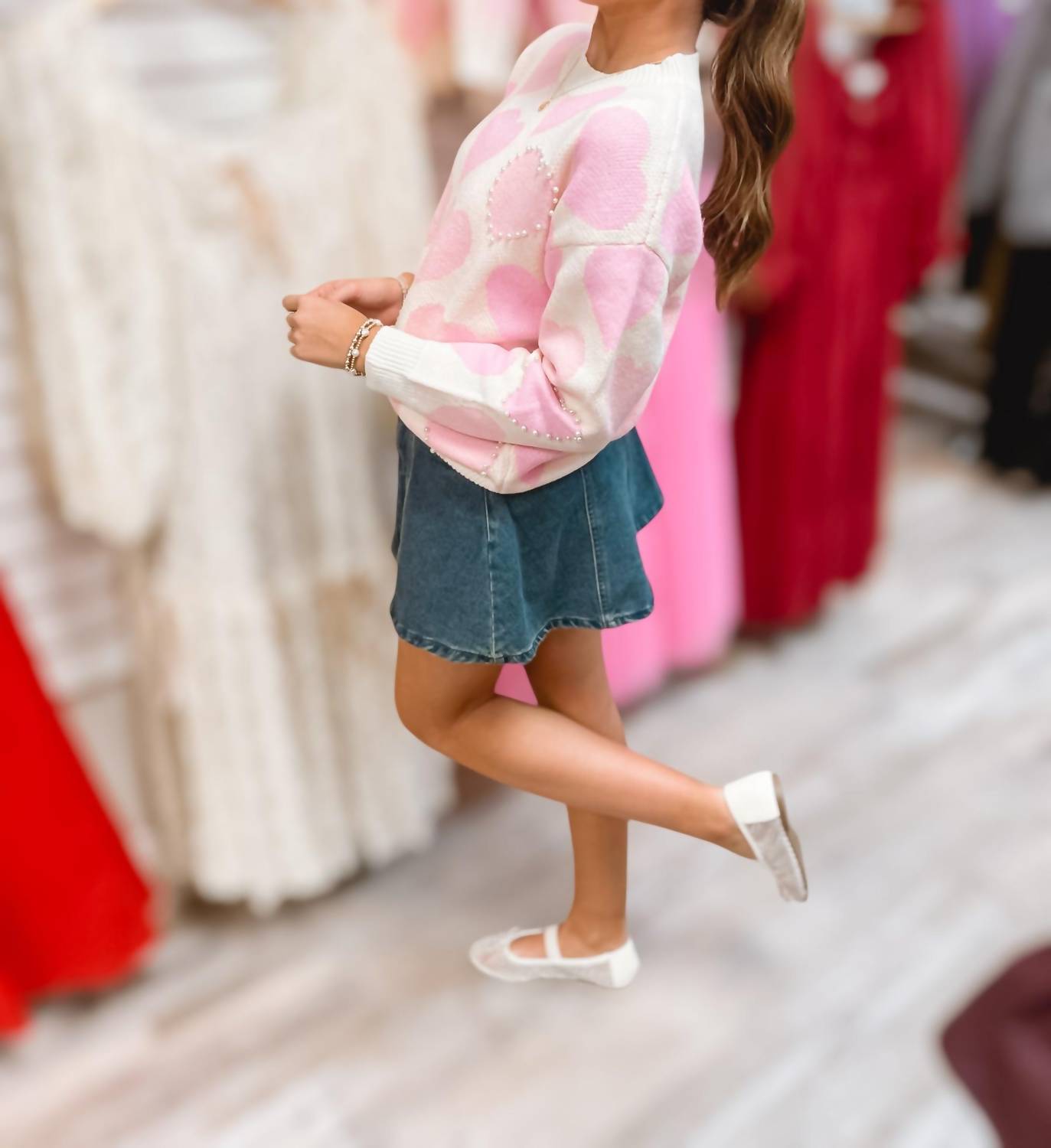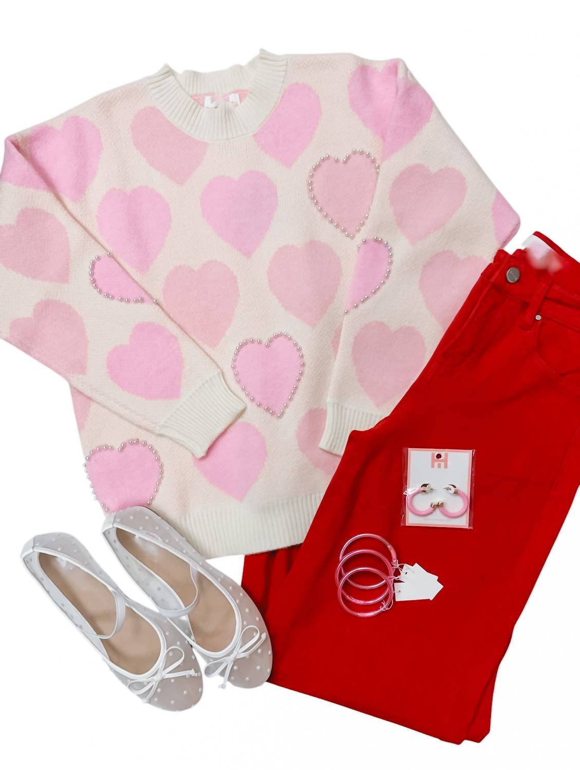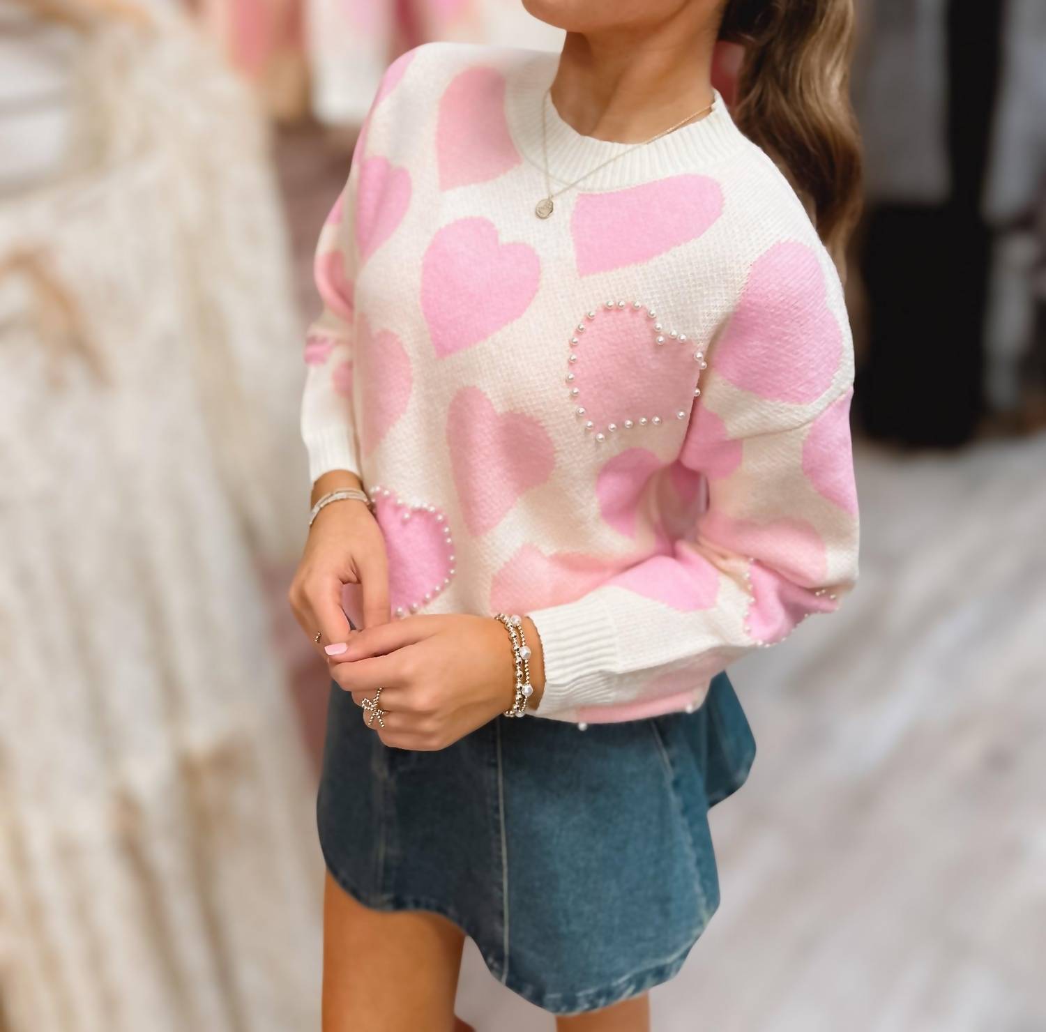 Embrace the romantic appeal of the Blu Pepper A Heart Wide Open Sweater in an enchanting Ivory and Pink palette, adorned with heart prints and pearl details for a charming touch. This women's sweater features long sleeves and a crew neckline, crafted from a blend of 48% Acrylic, 26% Nylon, and 26% Polyester, ensuring a lightweight wear. Measuring 24 inches in length, it offers a cozy fit to elevate your casual ensemble. Closure: Pull on for effortless styling.