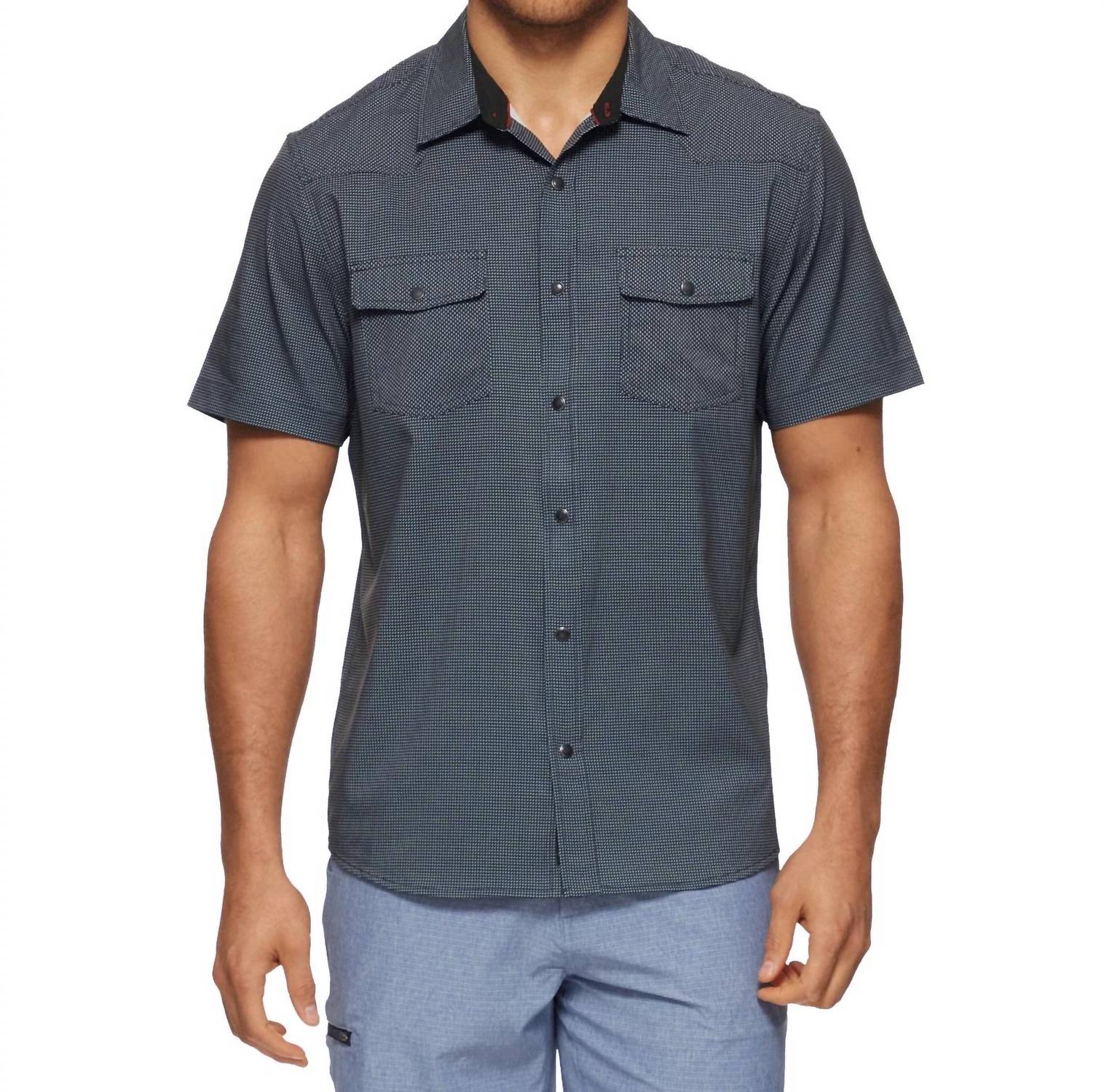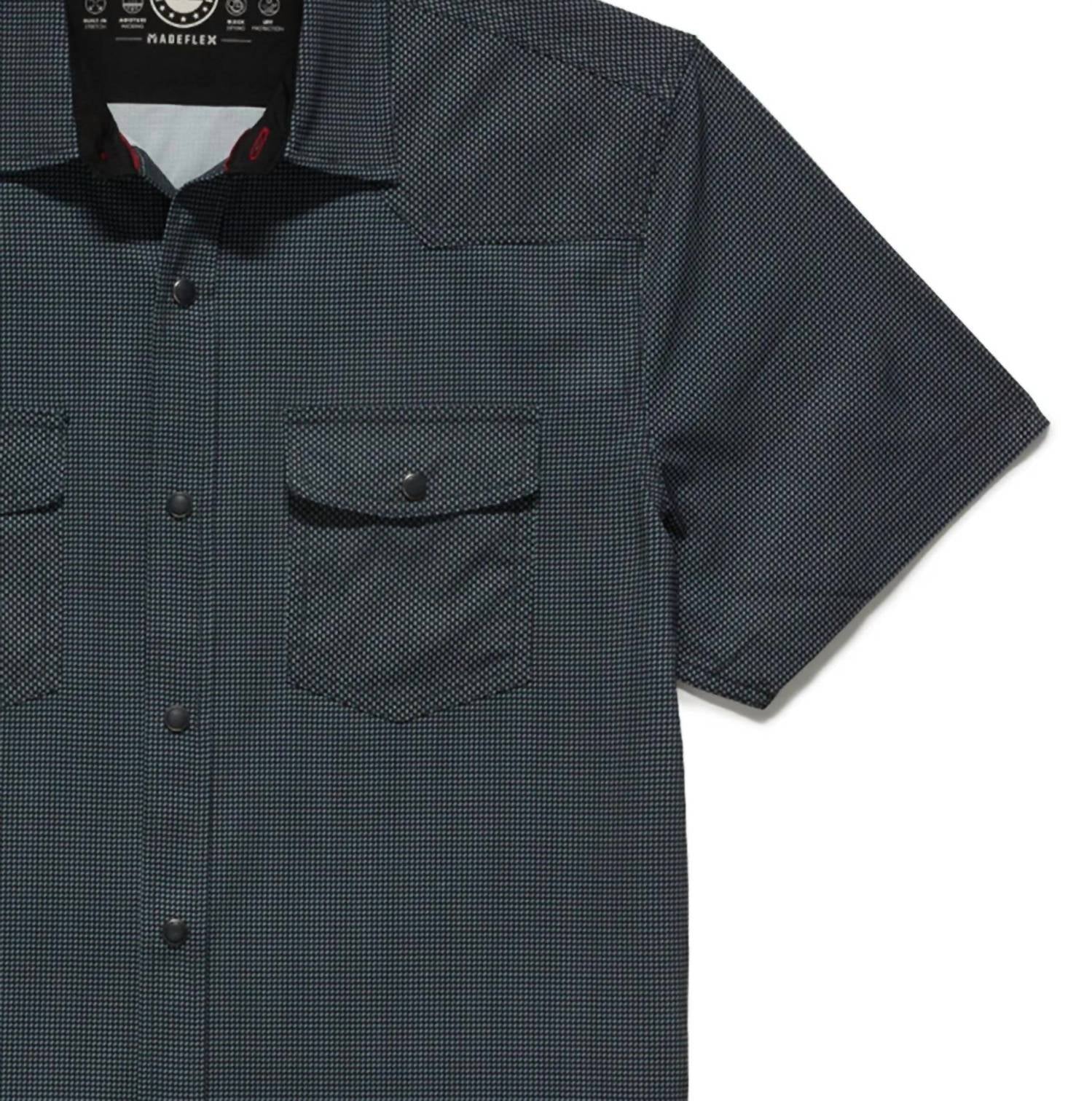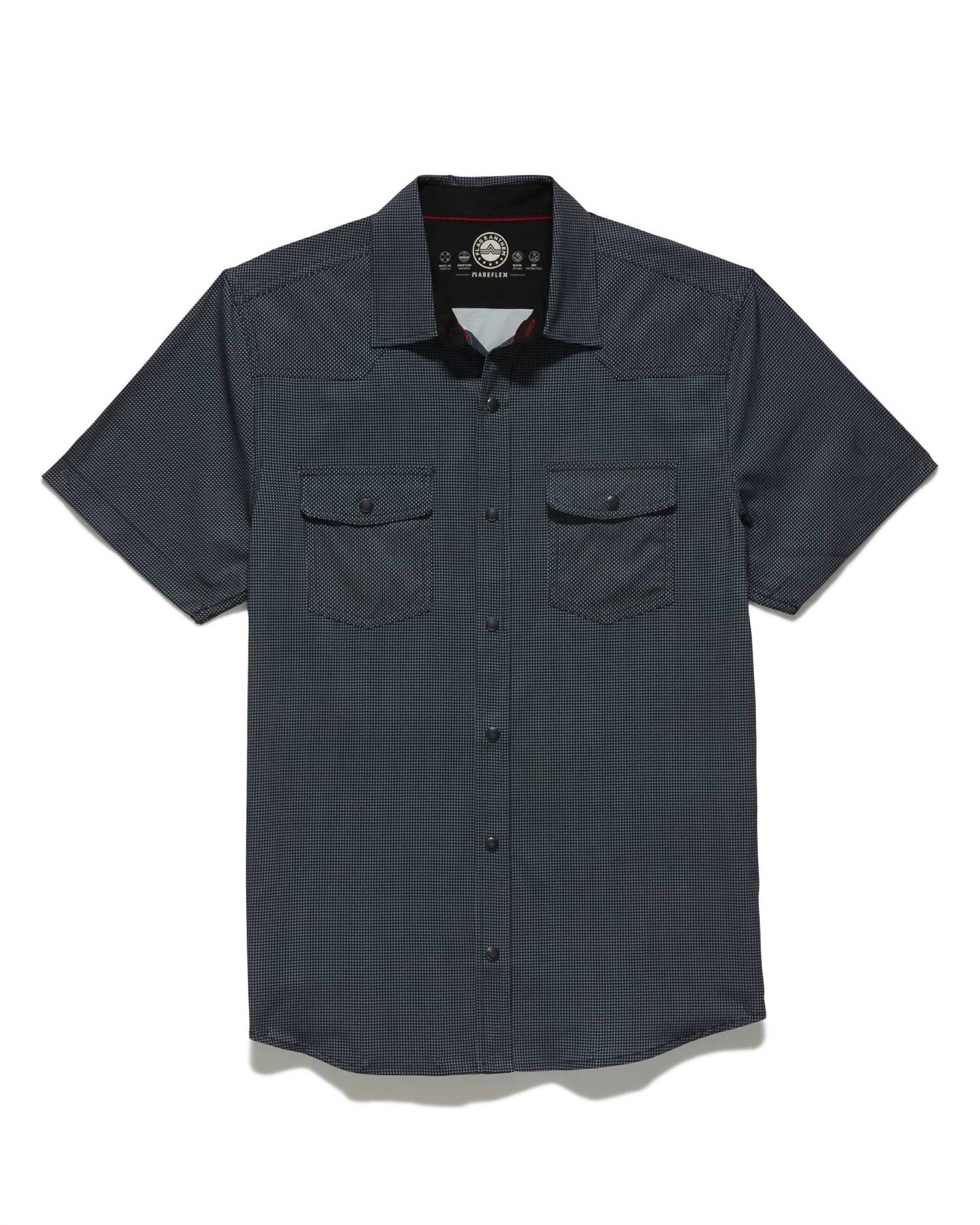 Experience the perfect fusion of style and performance with the Stevenson Short Sleeve Performance Western Shirt by Flags & Anthem in a sleek charcoal color. This shirt offers a tailored athletic fit made from 92% Polyester and 8% Spandex, maximizing comfort with its lightweight, breathable, and stretch fabric. It features dual front flap pockets with pearlized snap closures and a well-crafted design with contrast fabric details inside the collar stand, back yoke, front placket, and sleeve cuffs. MadeFlex Performance Technologies ensures moisture-wicking, quick-drying, and UPF protection, while the hidden lens cleaner at the hem adds convenience. Garment length is 29.5 inches, perfect for both tucked and untucked styles. Care: Machine wash and tumble dry for easy maintenance.