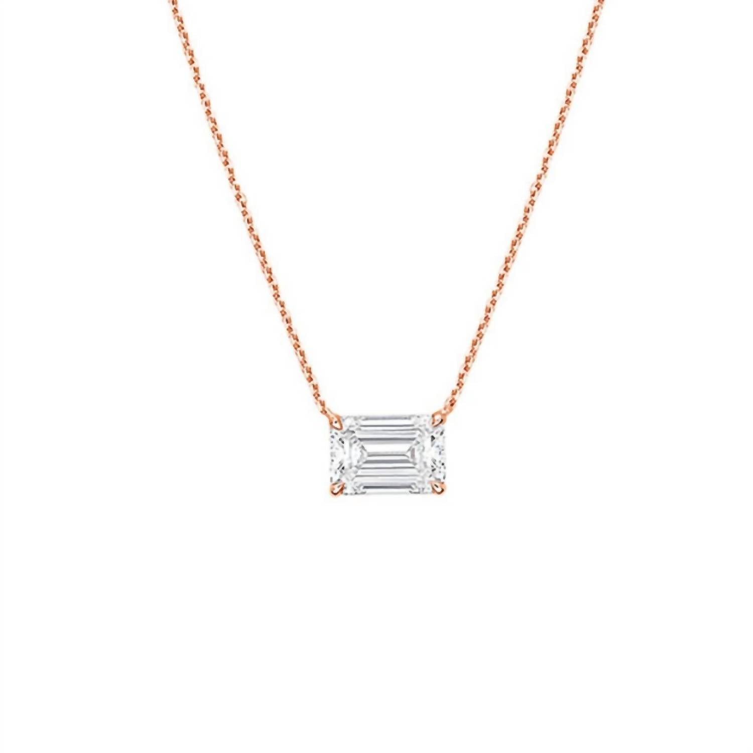 Layer this necklace or wear it on its own. Either way it's a win-win. Discover the elegance of the 14kt Rose Gold Diamond Solitaire Pendant Necklace by Diana M Jewels. This fine jewelry piece features a captivating 2.00 carat lab-grown diamond, set in a sophisticated east-west emerald cut with a prong setting. Displaying DEF color and VS clarity, the diamond exemplifies superior quality. The pendant is completed with a 16" chain and a secure lobster clasp, perfect for those who appreciate timeless design.
