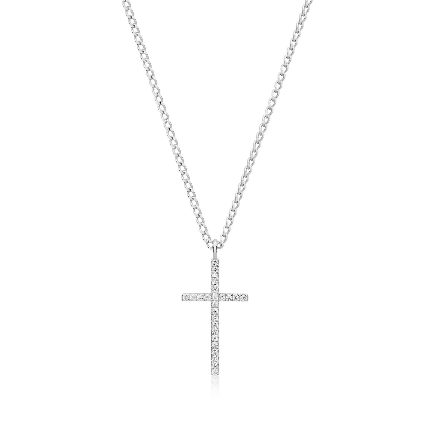 Introducing the Women's CZ Cross Pendant Necklace by Eklexic, a stunning piece in rhodium-plated sterling silver. This fine jewelry combines elegance with sustainability, featuring a 1-inch vertical cross pendant adorned with 25 cubic zirconia stones measuring 1.4mm each. The 16-inch necklace includes a 2-inch extension and a 2.3mm width curb chain, all finished in 14K gold plating with an ecoat for lasting shine. Embrace the luxury of recycled 925 silver, making it a versatile addition to any collection.