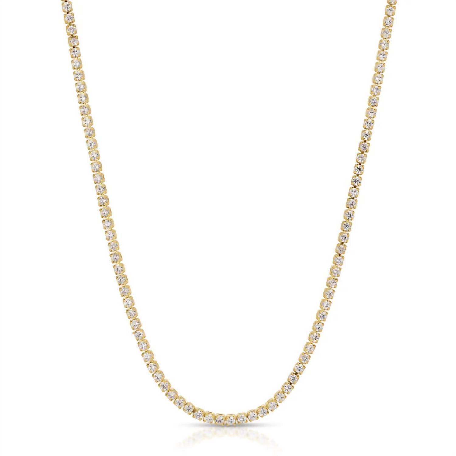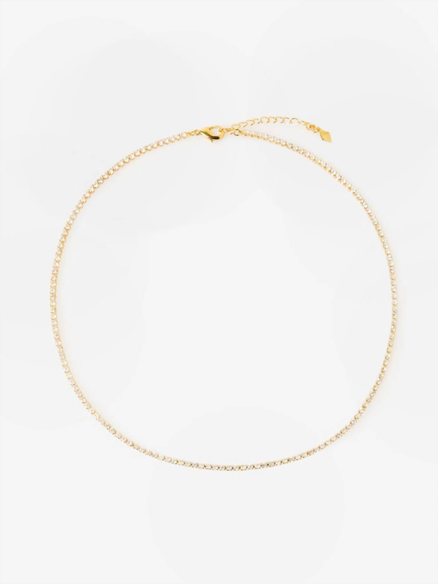 Elevate your jewelry collection with the Women's Gracie Tennis Necklace by JOY DRAVECKY, featuring a stunning classic white cubic zirconia design. This fine necklace is crafted with 14k gold plating over brass and adorned with 2mm CZ stones for an extra touch of shine. Measuring 16 inches with a 2-inch extender, it offers a customizable fit with its lobster clasp closure. Perfect as a standalone piece or layered with other favorites, this necklace is a timeless addition to any ensemble.