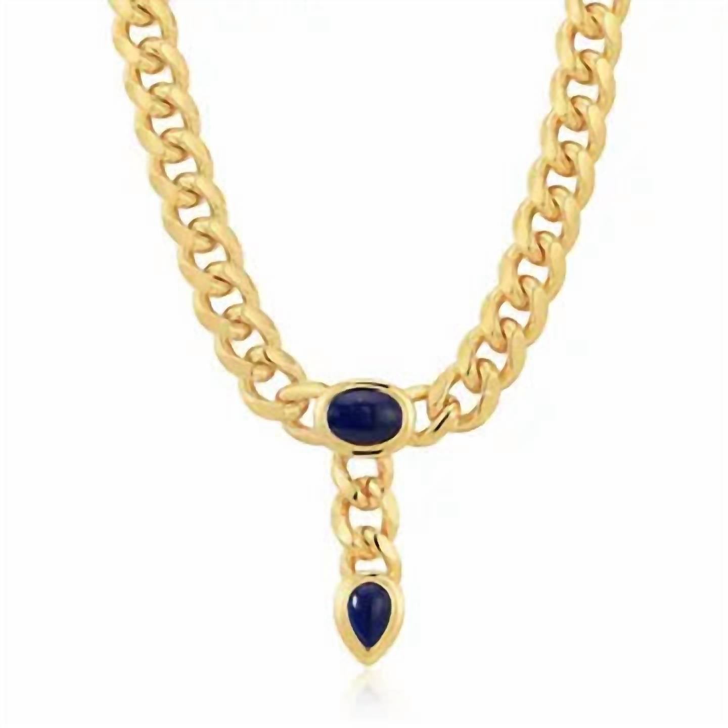 The perfect stand-out necklace that complements even the most basic t-shirt. Introducing the Women's The Lapis Lariat Necklace by LUV AJ, a statement piece that exudes elegance with its curb chain and striking lapis stone. This necklace measures 16 inches in length with a 10mm wide chain, crafted from plated brass with a luxurious high polish 14K Gold or Rhodium finish. Enjoy the durability of a waterproof and tarnish-free design, thanks to its 0.3-micron plating and e-coating, all while keeping it 100% nickel-free and cadmium-free.