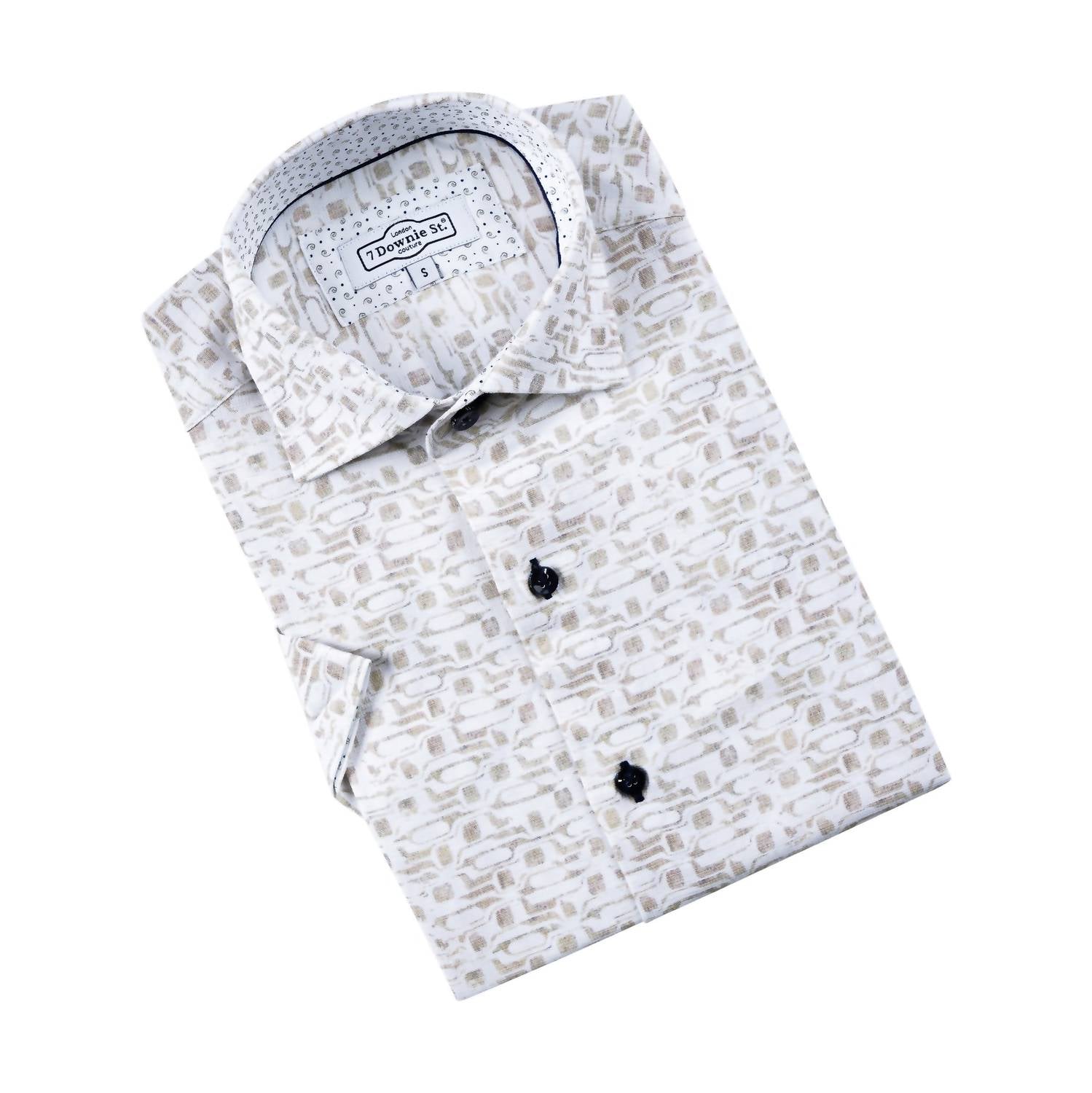 Introducing the Men's 765 Short Sleeve Button Down Shirt by 7 Downie St., a perfect blend of style and comfort for the discerning gentleman. Expertly crafted in a taupe cotton blend, this patterned shirt is designed for versatility and sophistication. Featuring a button closure and classic collar, it effortlessly transitions from a refined workwear staple to a relaxed church ensemble. With its short sleeves, this shirt is ideal for summer occasions, including Father's Day celebrations. Composition: 97% Cotton, 3% Elastane.