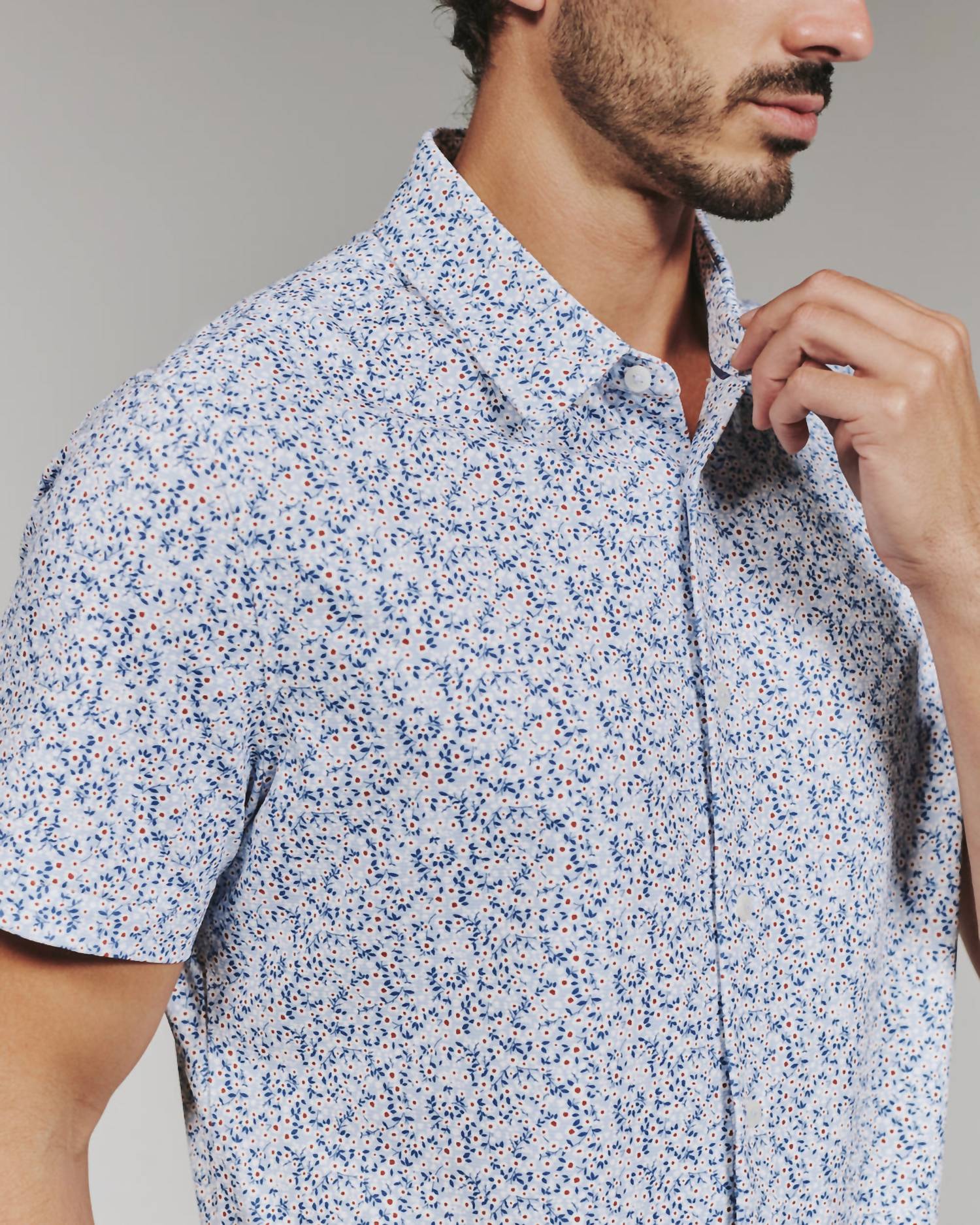 Elevate your summer workwear with the Mercer Short Sleeve Shirt by 7Diamonds, crafted in a patterned light blue. Made from 94% polyester and 6% spandex, this casual button-down shirt offers both comfort and a sleek appearance. Featuring a classic collar, the shirt boasts a button closure for a polished finish. Care instructions recommend hand washing and line drying to maintain its quality.