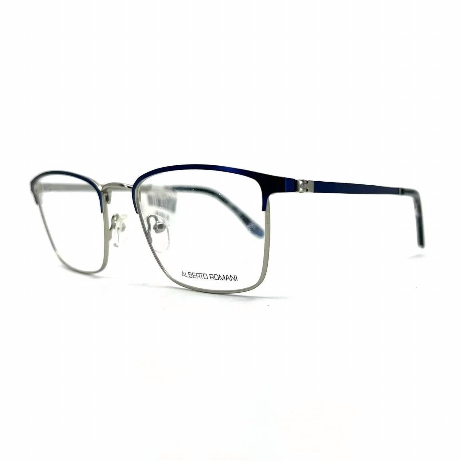 Discover the Men's Ar 20203 Eyeglasses by Alberto Romani, showcasing a sophisticated frame in a navy square design. These full-rim sunglasses feature a robust frame made from metal, ensuring durability and style. Frame dimensions include a bridge width of 18mm, lens width of 54mm, and a temple length of 140mm for a comfortable fit. Ideal for adding a refined touch to your eyewear collection.