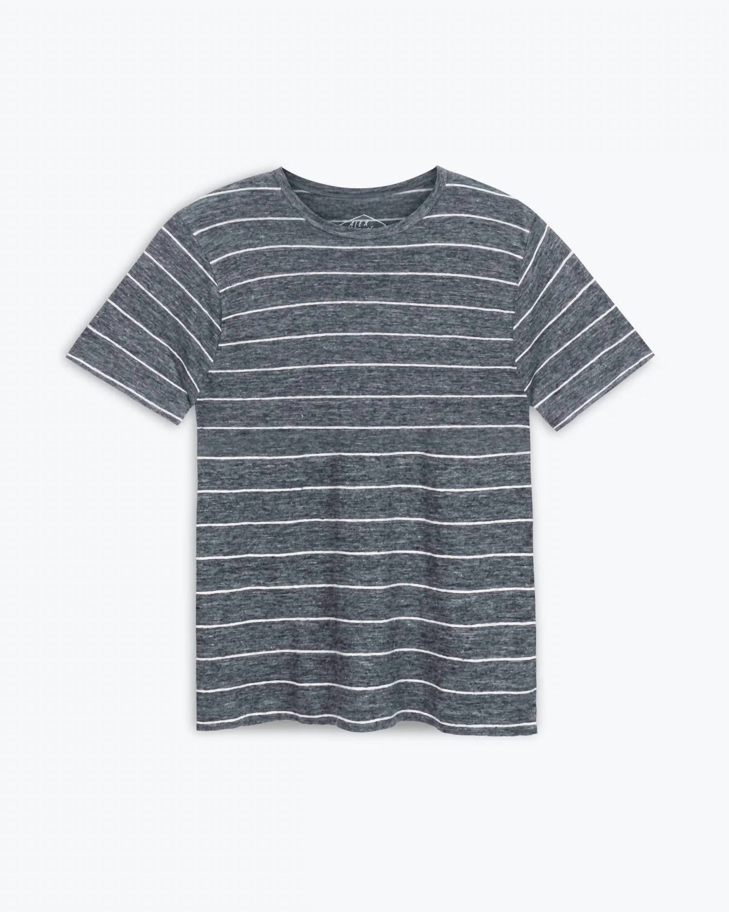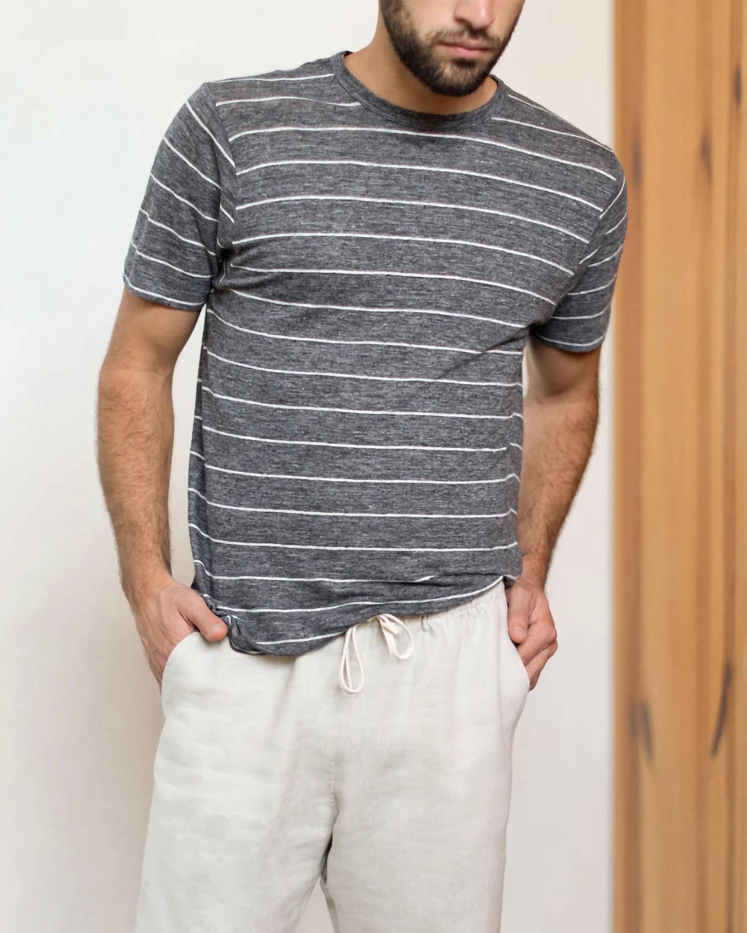 Introducing the Pine Tee Shirt by Alex Crane, a sustainable fashion choice crafted for men's minimalist summer wear. This solid deep green t-shirt features short sleeves and a classic crewneck, made from premium French linen and knit in Portugal. Designed for effortless style and comfort, it offers a convenient pull-on closure. Care instructions include machine washing and tumble drying.