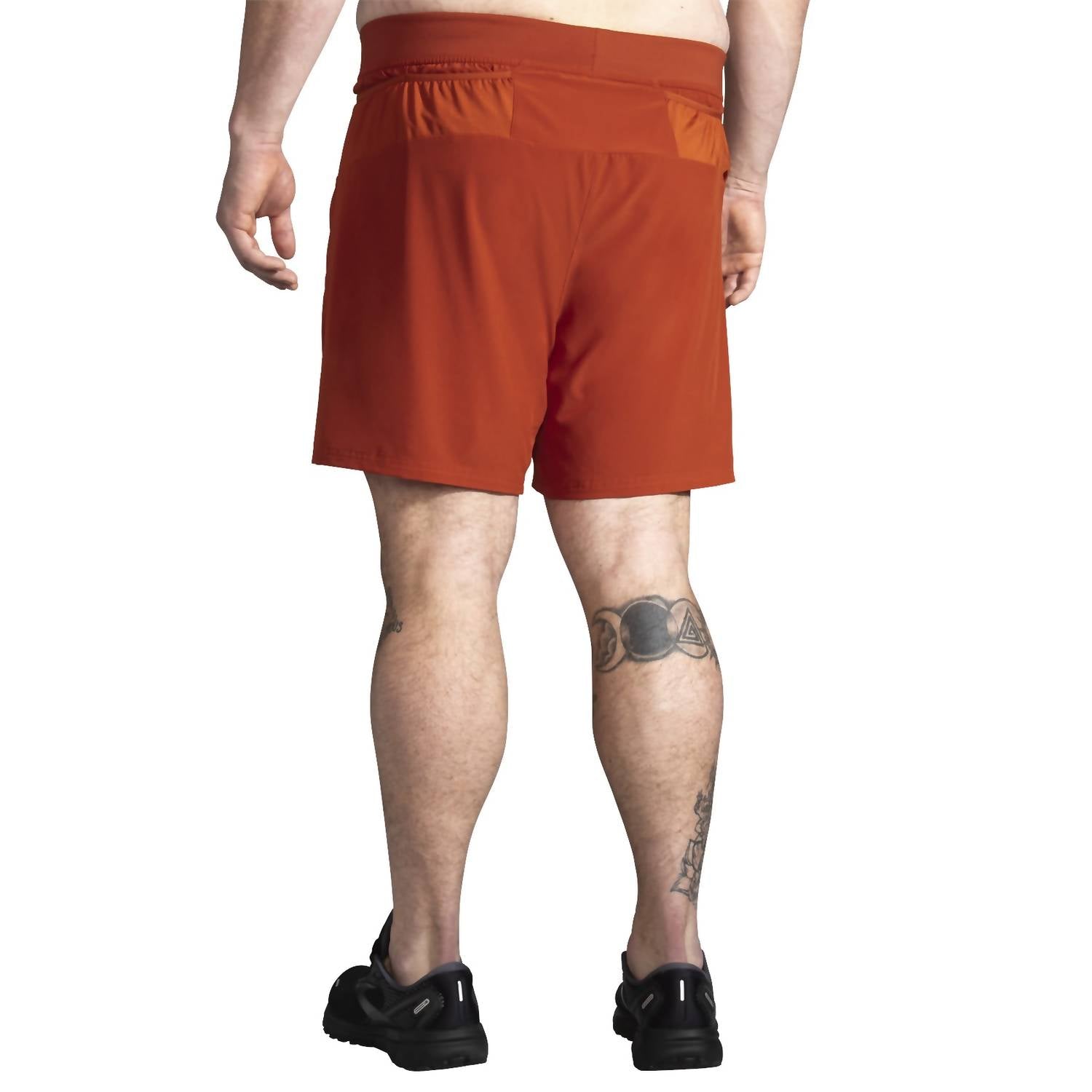 Introducing the Men's Sherpa 7" Short by BROOKS, a perfect blend of comfort and practicality in a solid red clay hue. These athletic shorts feature a 2-in-1 liner system with an inseam of 7 inches, offering semi-fitted wear for unrestricted movement during your warm weather runs and training. Made with 80% recycled materials, these shorts have the added benefit of supporting sustainability by diverting seven plastic bottles from landfills. Equipped with convenient storage options, they have a pull-on closure type and are easy to care for with machine wash and tumble dry instructions.
