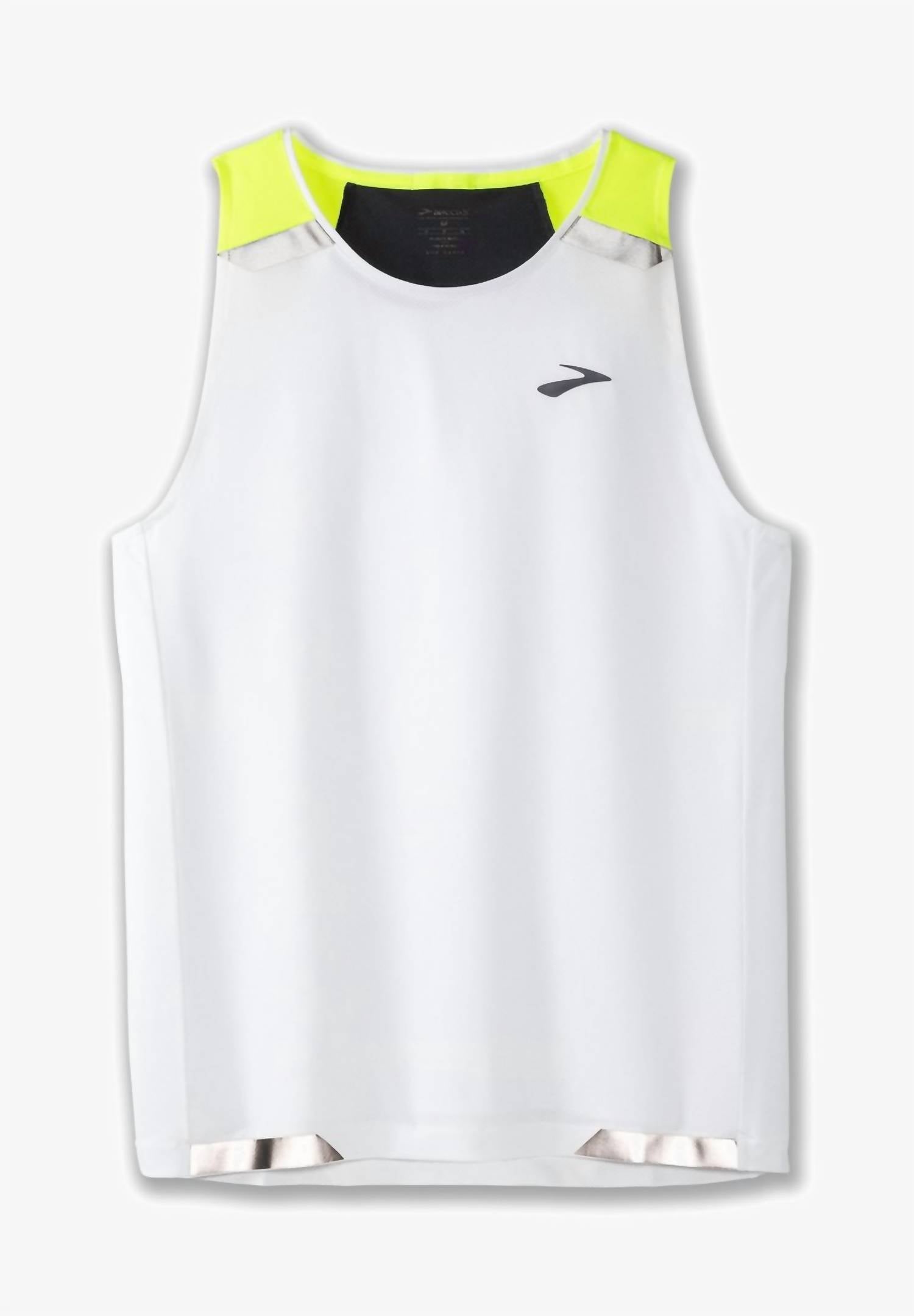 Stay cool and dry during your workout with the Run Visible Tank Top by BROOKS in White/Asphalt/Nightlife. This sleeveless tank is crafted from 89% polyester and 11% elastane, ensuring quick drying and sustainable comfort. Designed with fitness and dark running in mind, it features visibility-enhancing elements for your safety. With a pull-on closure, care for this tank is easy—simply machine wash separately and tumble dry on low heat.