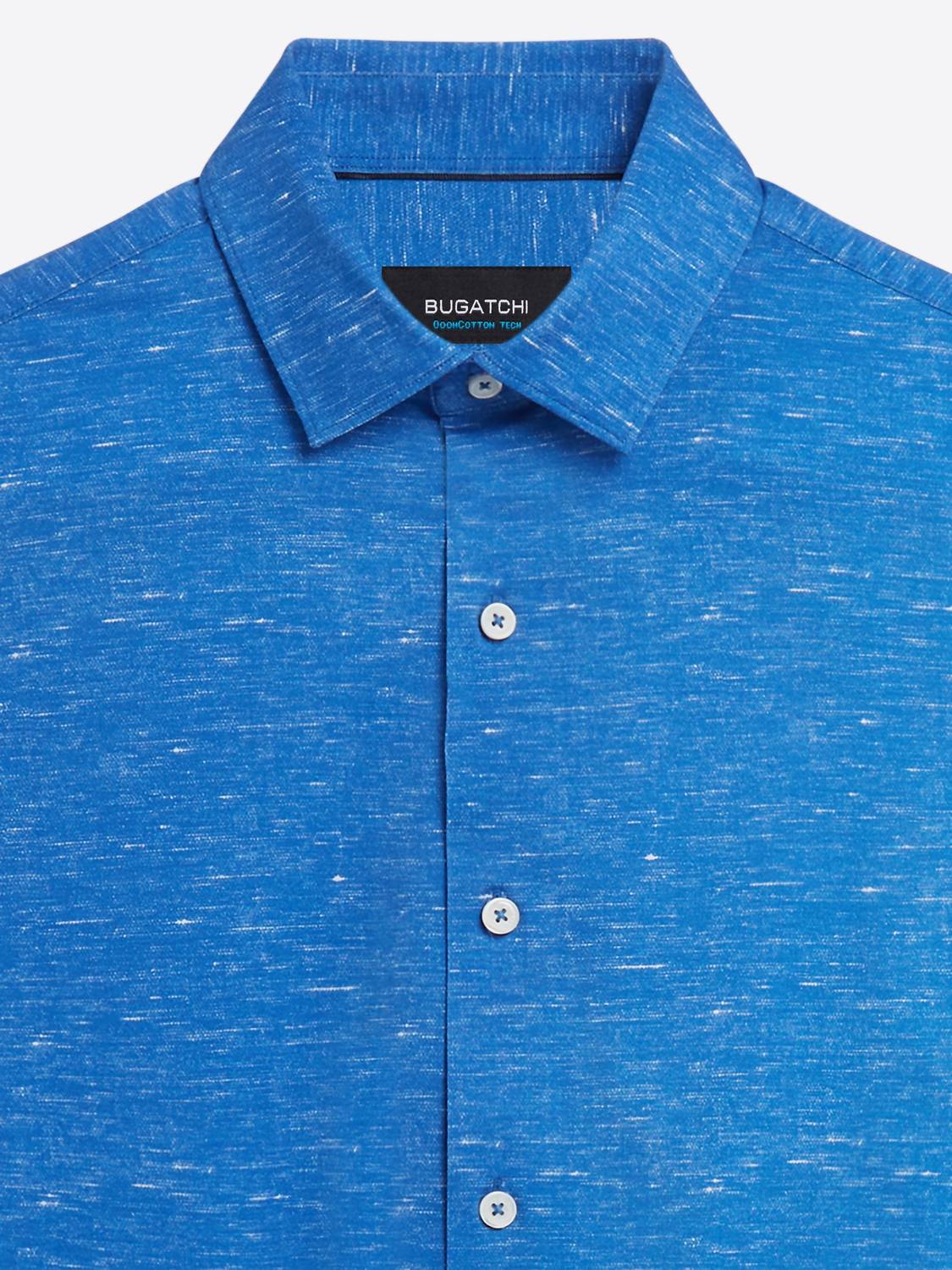 Introducing the Men's Ooohcotton Tech Long Sleeve Shirt by Bugatchi Uomo, an elegant addition to your wardrobe in a striking blue hue. This long-sleeve shirt is crafted from 92% cotton and 8% spandex, featuring a French placket and a sleek point collar for a polished look. With no pockets for a streamlined appearance, it is designed with a solid pattern perfect for workwear or engagement occasions. Closure: Button closure. Care: Machine wash.