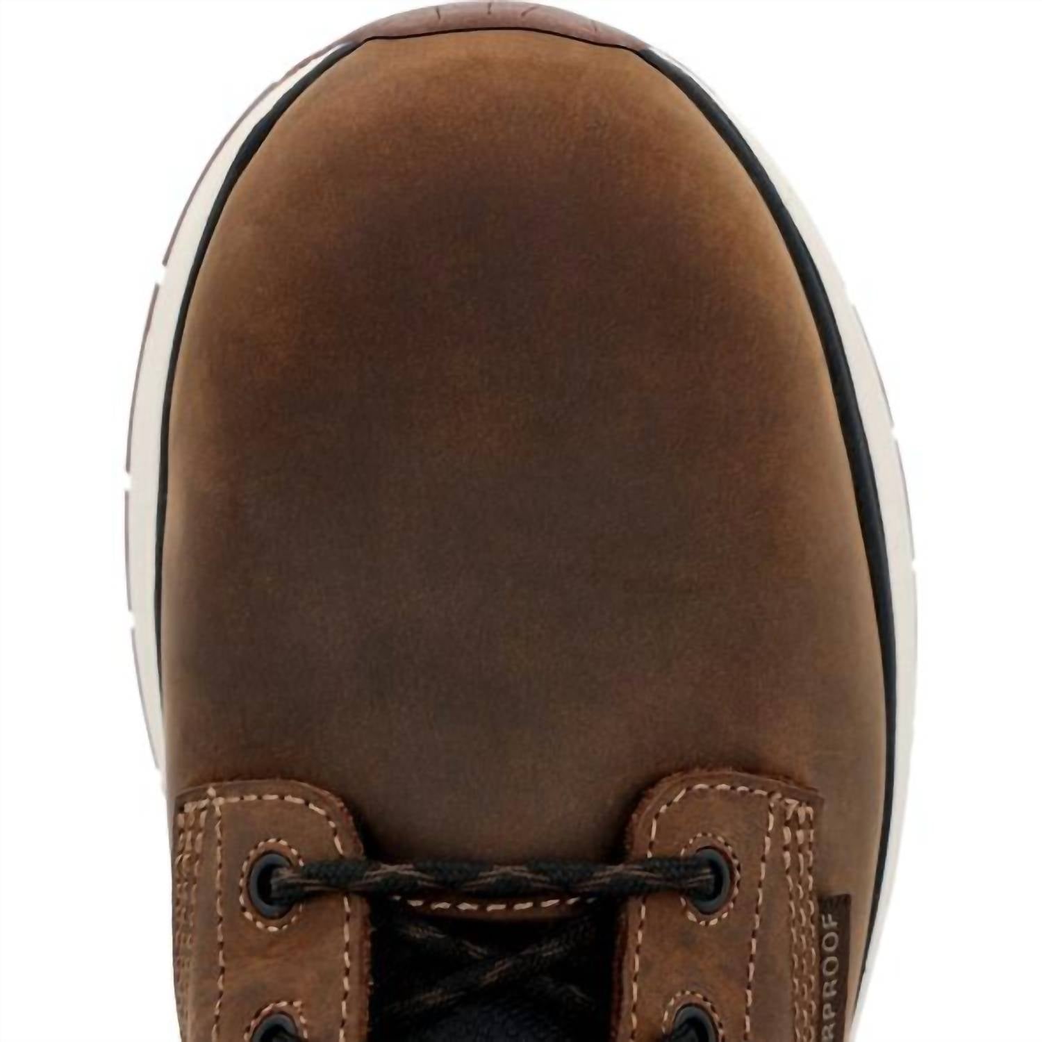 Explore the Men's Sport Wedge Waterproof Work Hiker Boot by Georgia Boot for unbeatable durability and comfort. Crafted in dark brown full-grain leather, these boots stand at 6 inches and feature a round toe design. Engineered with a flexible non-metallic construction, they include a fiberglass shank and ASTM F2892 electrical hazard standard for safety. The high-performance mesh lining, Quick Response Polyurethane foam removable insole, and Stretch Gusset technology ensure comfort, while the dual-density EVA and Carbo-Tec rubber outsole provides heat, chemical, abrasion, and slip resistance. Each shoe weighs 1.35 lbs (size 10M, medium width), with a heel height of 1 3/4 inches.