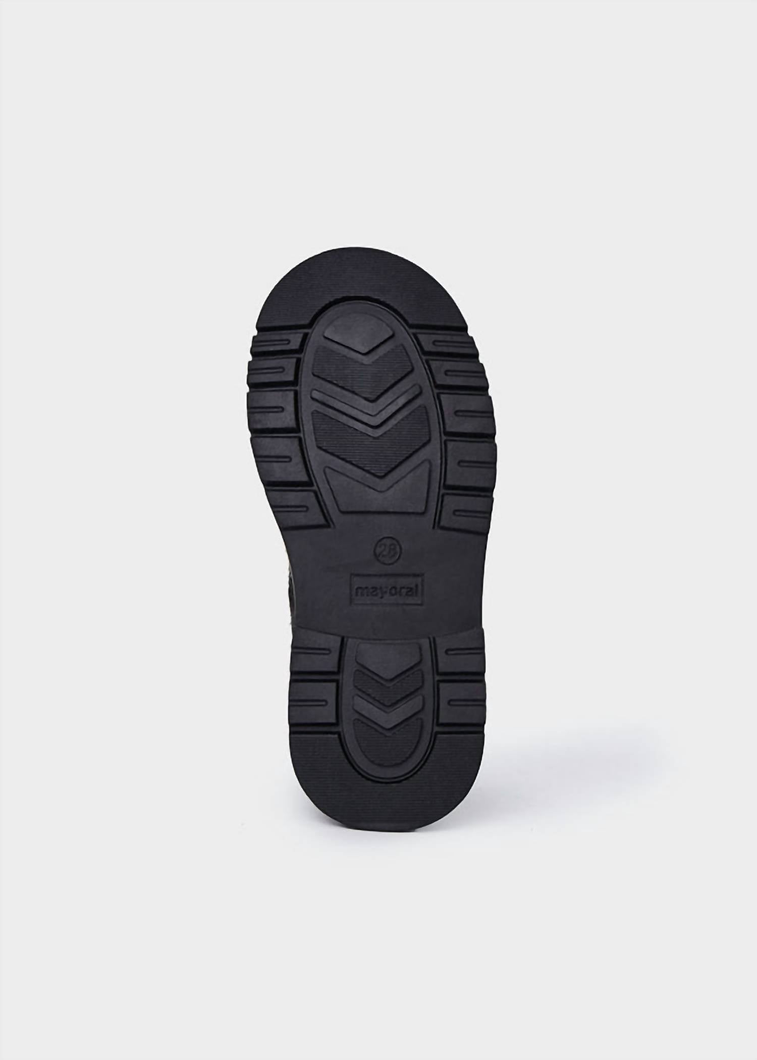 Introducing the Kid's Leather Chelsea Biker Boot Mid by Mayoral, perfect for a summer of streetwear style. These boots are made from sustainable leather and feature a durable rubber sole designed to withstand the seasons. They come with a convenient side zip closure and have a medium shoe width with a flat heel under 1 inch, making them comfortable for big kids. The classic round toe adds to the sleek, black design, ideal for any homecoming occasion.