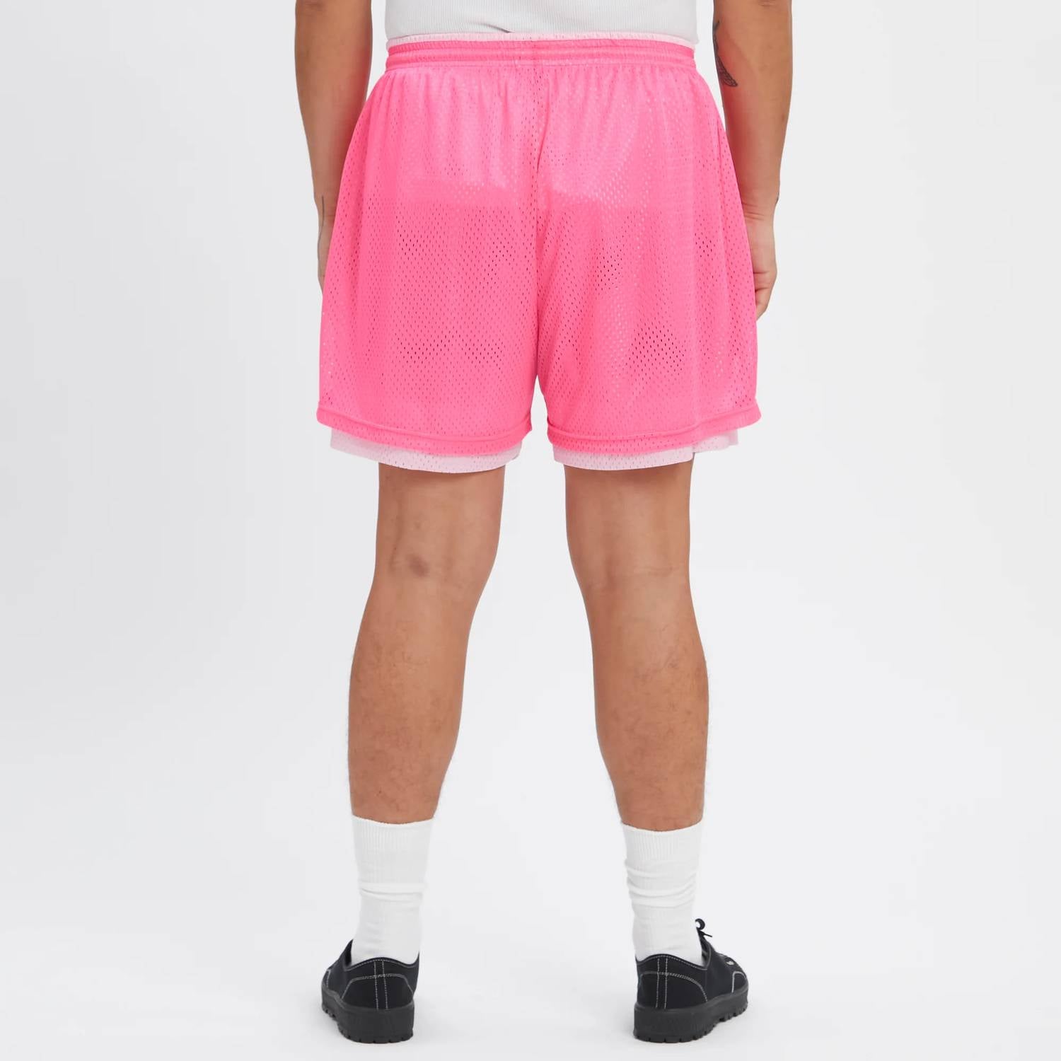 Upgrade your athleisure wardrobe with the Reversible Ball Short by s.k. manor hill, featuring a stylish pink and fuchsia textured design. These men's basketball shorts come with an elastic waistband and convenient side on-seam pockets on both sides for practicality. Made in the USA from 100% polyester, they offer a breathable mesh material that's perfect for summer activities. Enjoy a pull-on closure and easy care with a simple hand wash recommendation.
