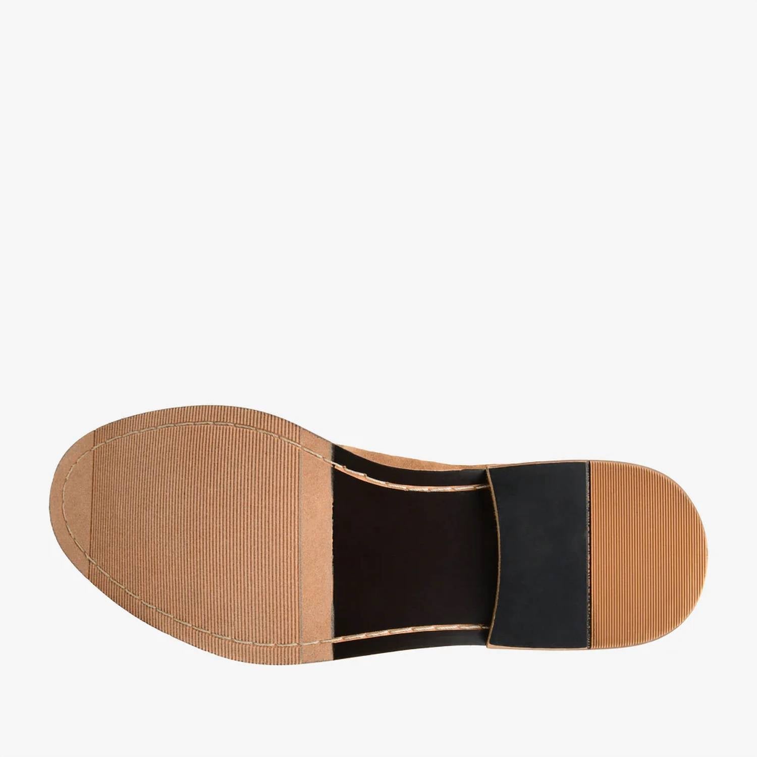 Introducing the Men's Marshall Dress Boots by Vance Co., a versatile taupe boot perfect for both office and casual outings. This iconic Chelsea silhouette features a convenient pull-on closure with stretch goring and a practical pull-tab. Crafted from high-quality faux suede with a faux leather lining, it sits atop a 1-inch block heel and 1/2-inch platform, featuring a round toe for added style. The cushioned 5 MM footbed and rubber outsole ensure comfort and durability, making it ideal for the fall season.