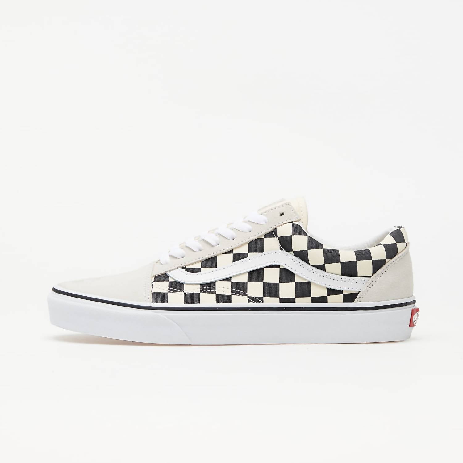 Discover the Unisex Vans Old Skool Shoe in Checkerboard White, a timeless selection for both men and women that defines streetwear style. The shoe features sturdy canvas material with a signature Vans checkerboard print, enhanced by re-enforced toecaps and padded collars for maximum support and flexibility. Designed with a flat heel and round toe shape, these sneakers offer a comfortable flat heel height of under 1 inch. Perfect for summer vacations, these classic sneakers complement any casual outfit.