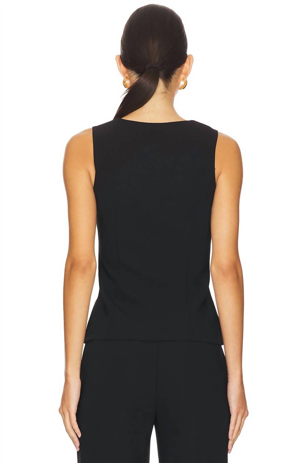 The Carnegie Sleeveless Vest by Amanda Uprichard is the ideal choice for a sophisticated fall dinner party ensemble. Crafted from 100% polyester with a 100% polyester lining, this elegant black vest showcases a V-neck and solid pattern, emphasizing its timeless preppy trend. Its crepe fabric construction is complemented by a front button closure for easy wear. Made in China, it requires dry cleaning to maintain its pristine condition.