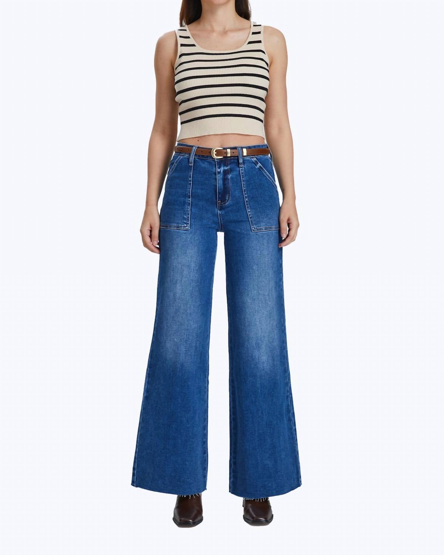 Introducing the High Rise Utility Wide Leg Jeans by Bayeas, crafted for a bold yet relaxed style in dark indigo. These jeans feature a high-rise fitted waist with a contemporary wide-leg silhouette, designed with a zip closure and embroidered detailing for added flair. Composition: 94% Cotton, 4% Polyester, 2% Spandex. Inseam: 32'', with a front rise of 11''. Complete the look with the unique raw hem for an on-trend finish. Care: Machine wash and tumble dry. Perfect for a summer vacation wardrobe, fitting true to size. Model is 5'8" wearing a size 26.