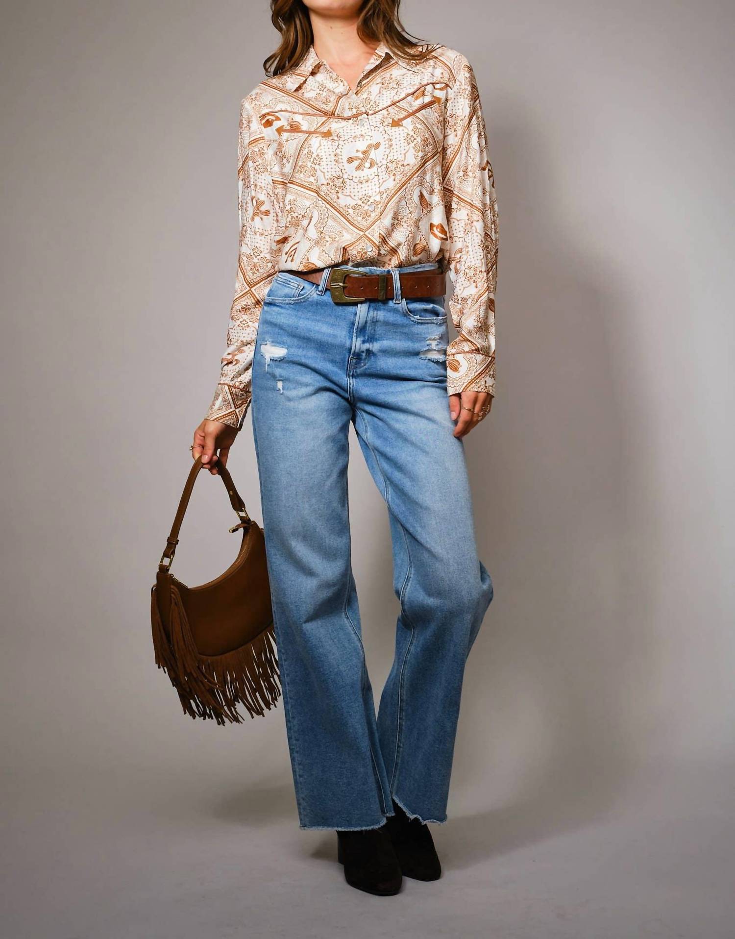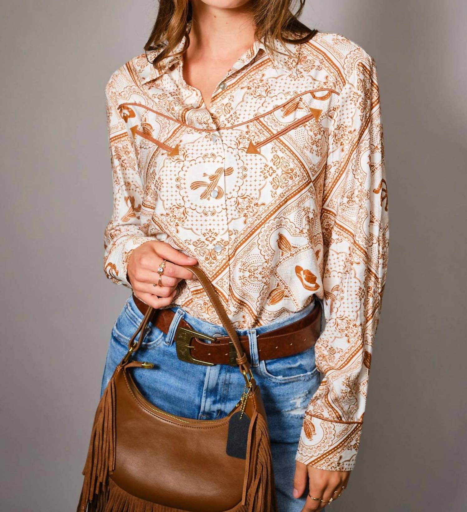 Embrace the Western flair with the Western Button-up Shirt by Blue B, a standout piece in burnt orange perfect for any dinner party. Featuring long sleeves and a relaxed fit, this shirt boasts an intricate western-themed pattern and a pointed yoke detail. Material: 100% Rayon. Closure: Snap button closure.